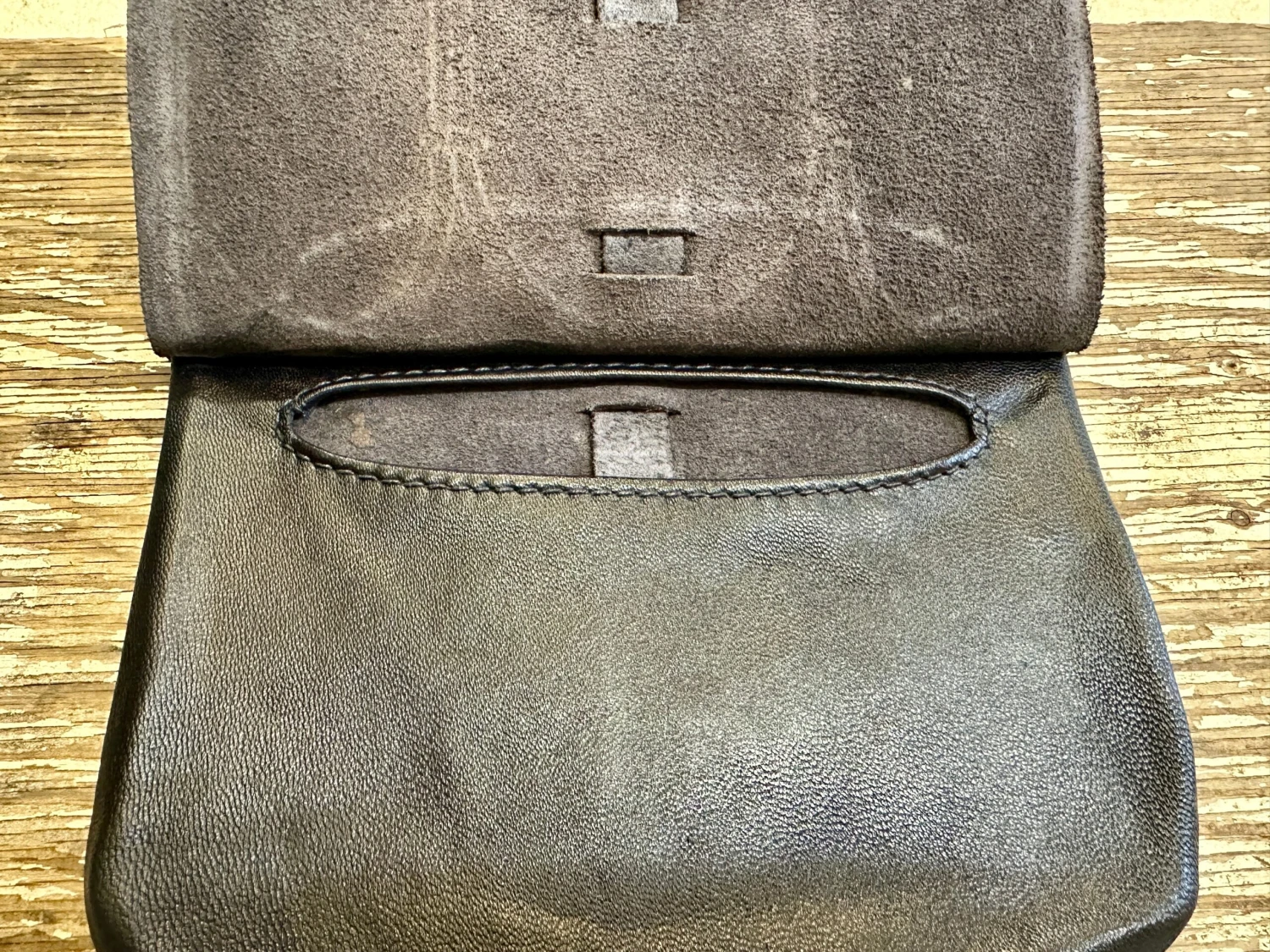 14th/15thC leather belt pouch with incised decoration and thong work to the front. Soft leather liner with a stitched hand opening a bit smaller than the width of the bag to put off those pesky cut purses and dippers.