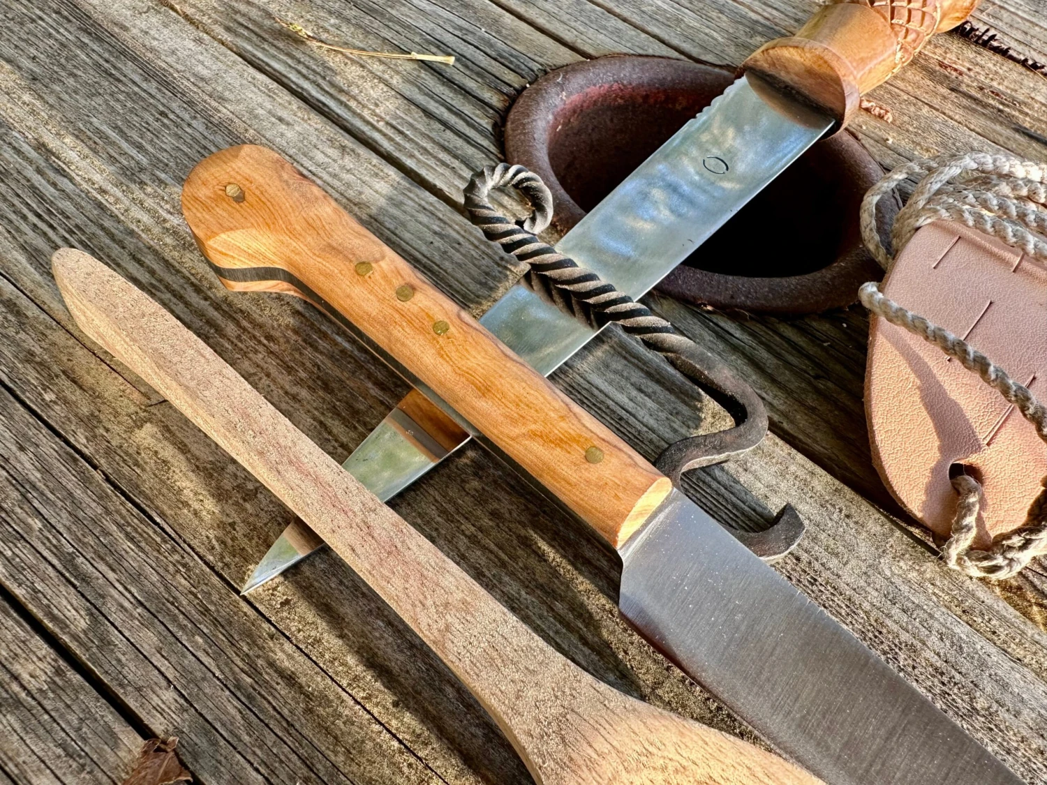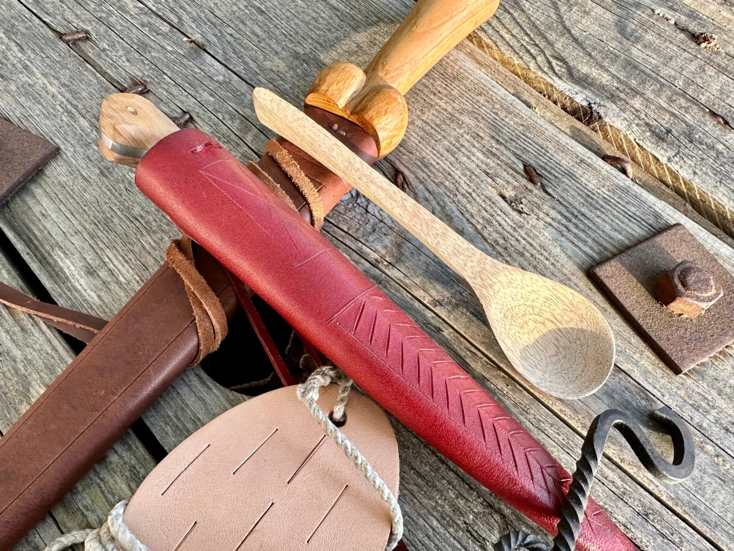 Wooden handle, brass rivets, Carbon steel blade, decorated veg tan leather sheath.