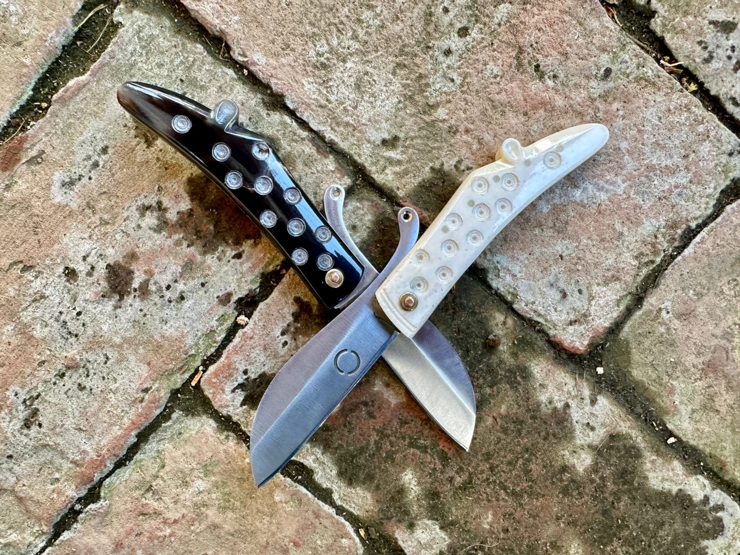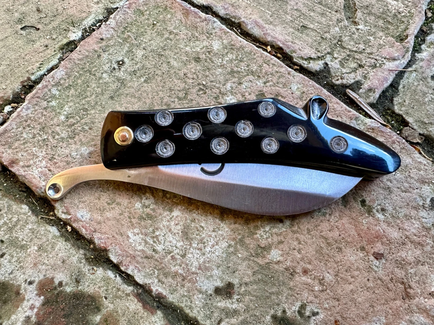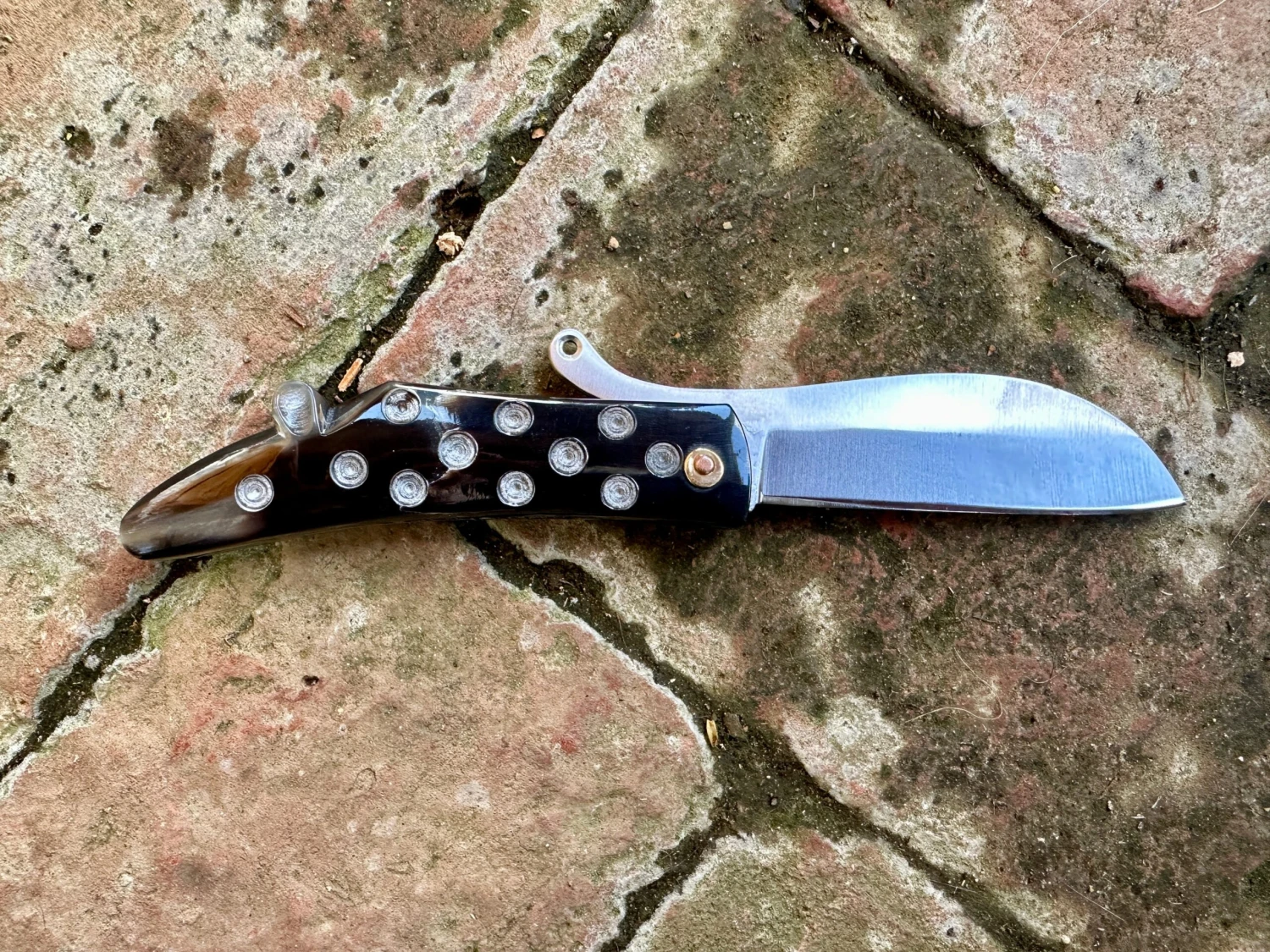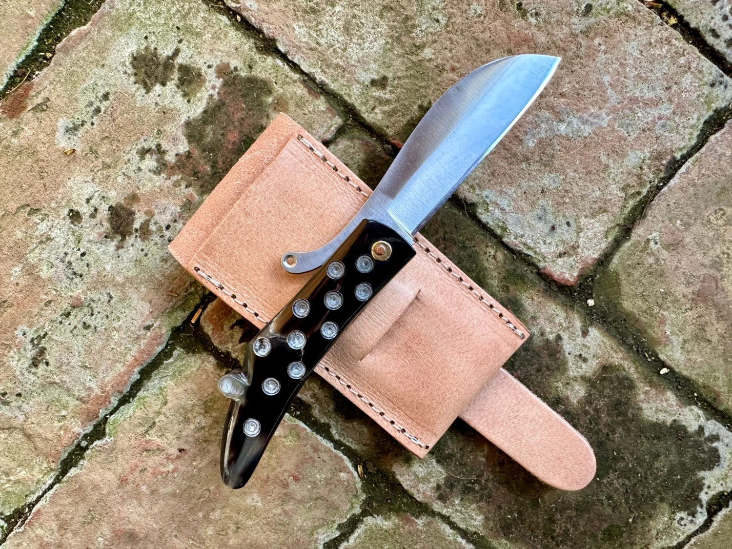 This reproduction 14thC-15thC Medieval folding knife has a distinctive zoomorphic outline of an unidentified animal; rat, mouse, horse? Who knows? But it is pretty and is decorated with the commonly found ‘dot and circle’ motif popular from Roman to Renaissance times. Based on a Thames find and is available in either bone as the original was, or horn.
