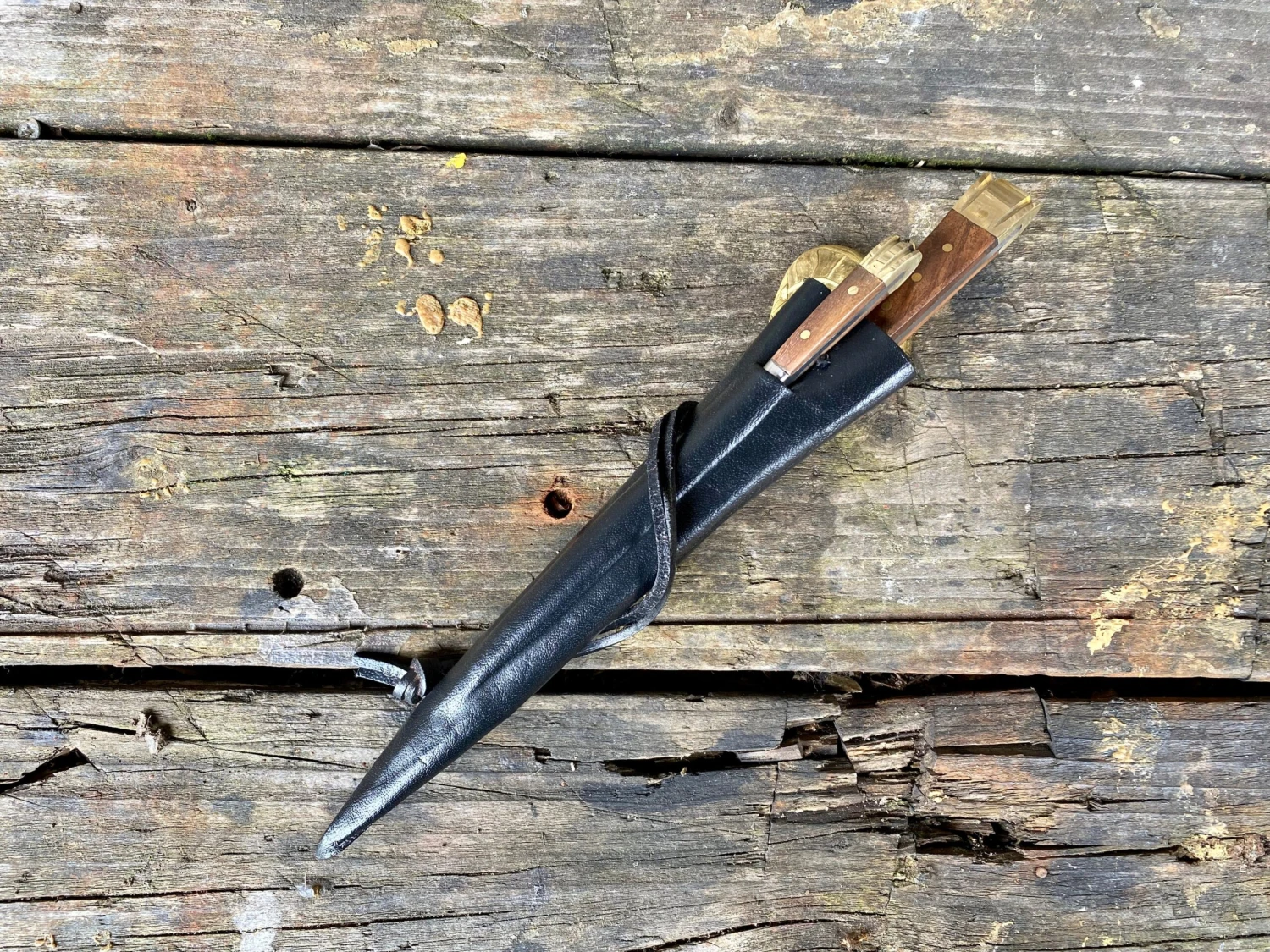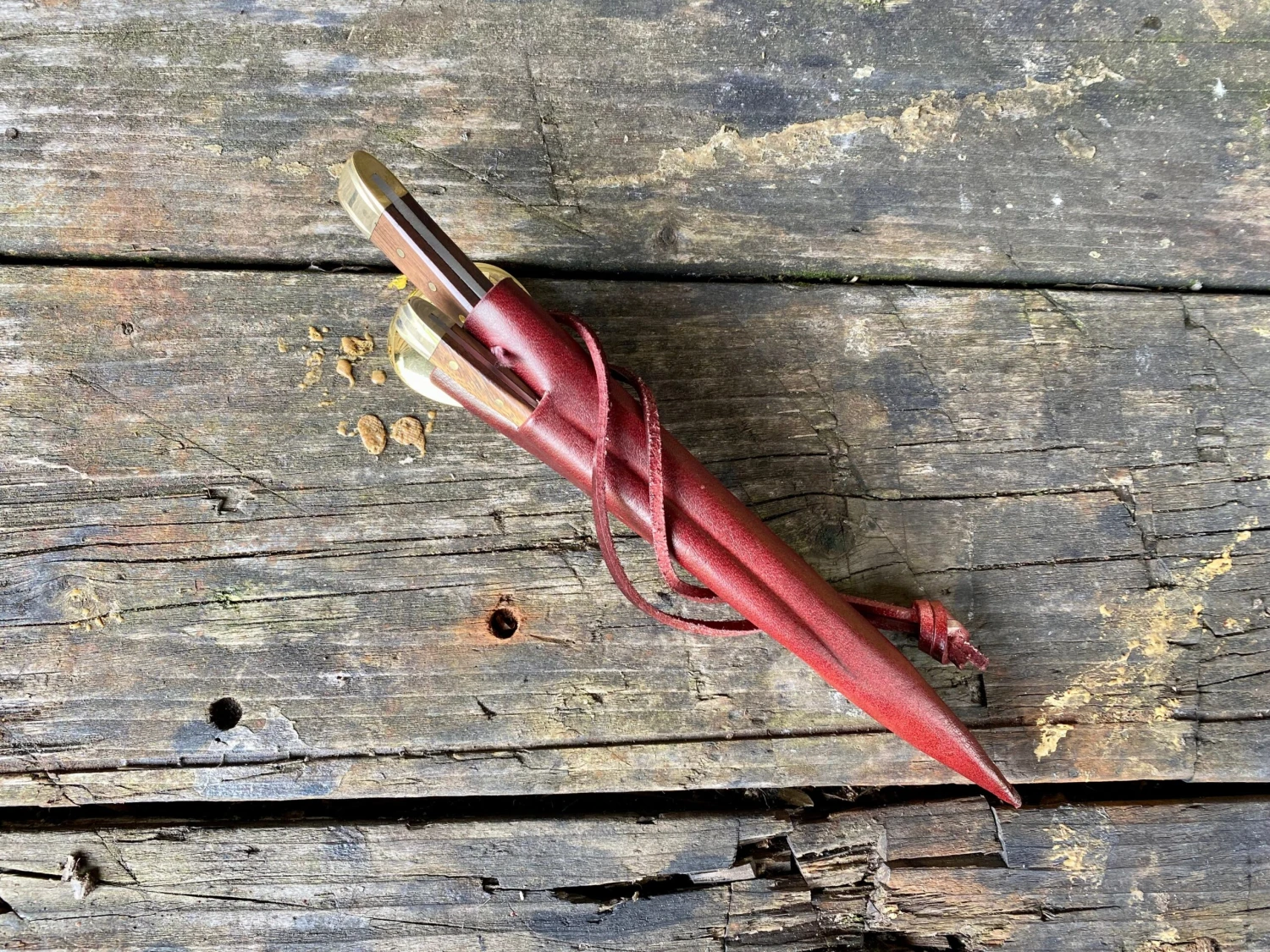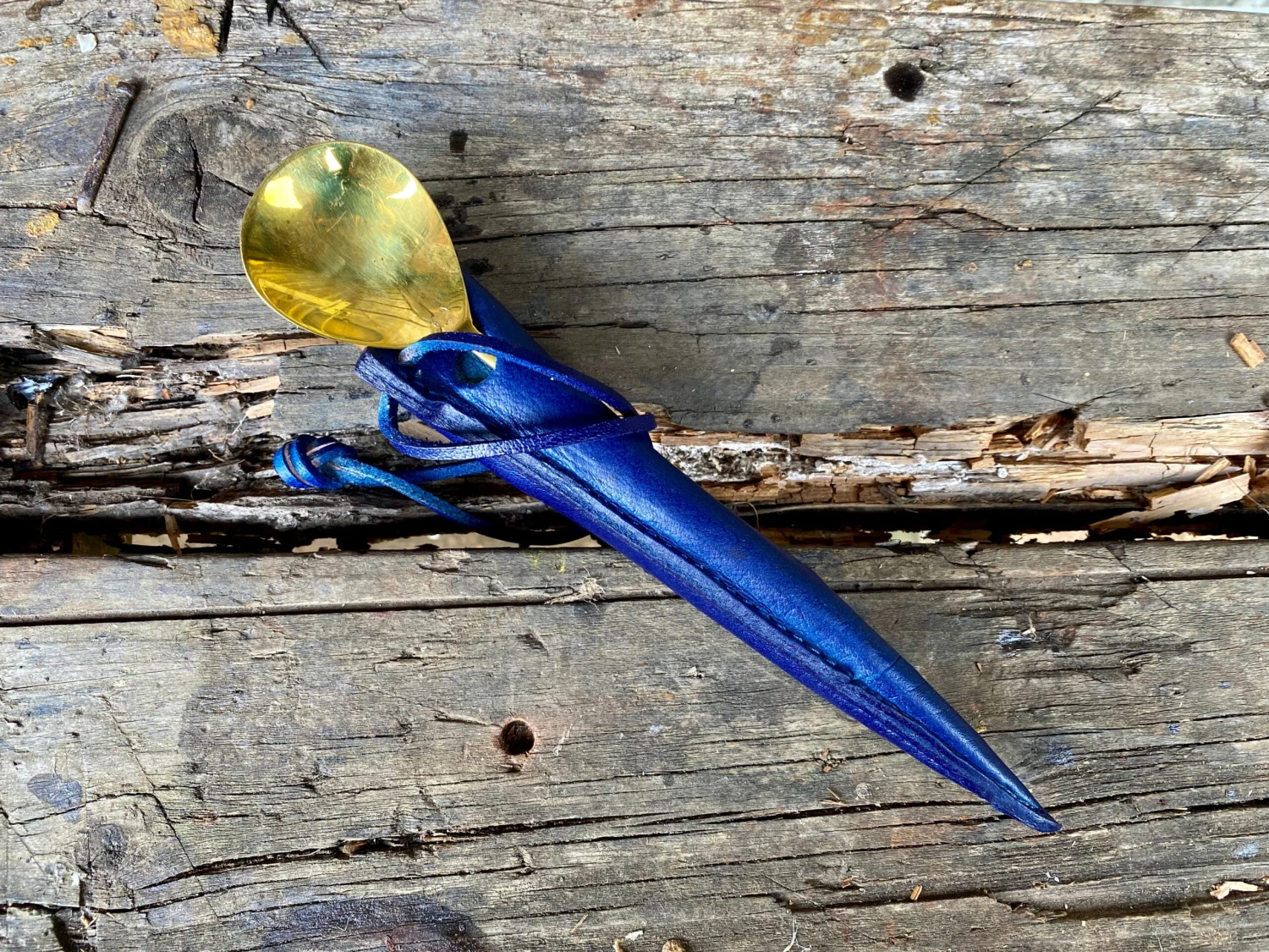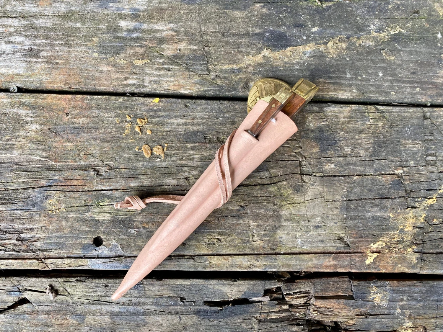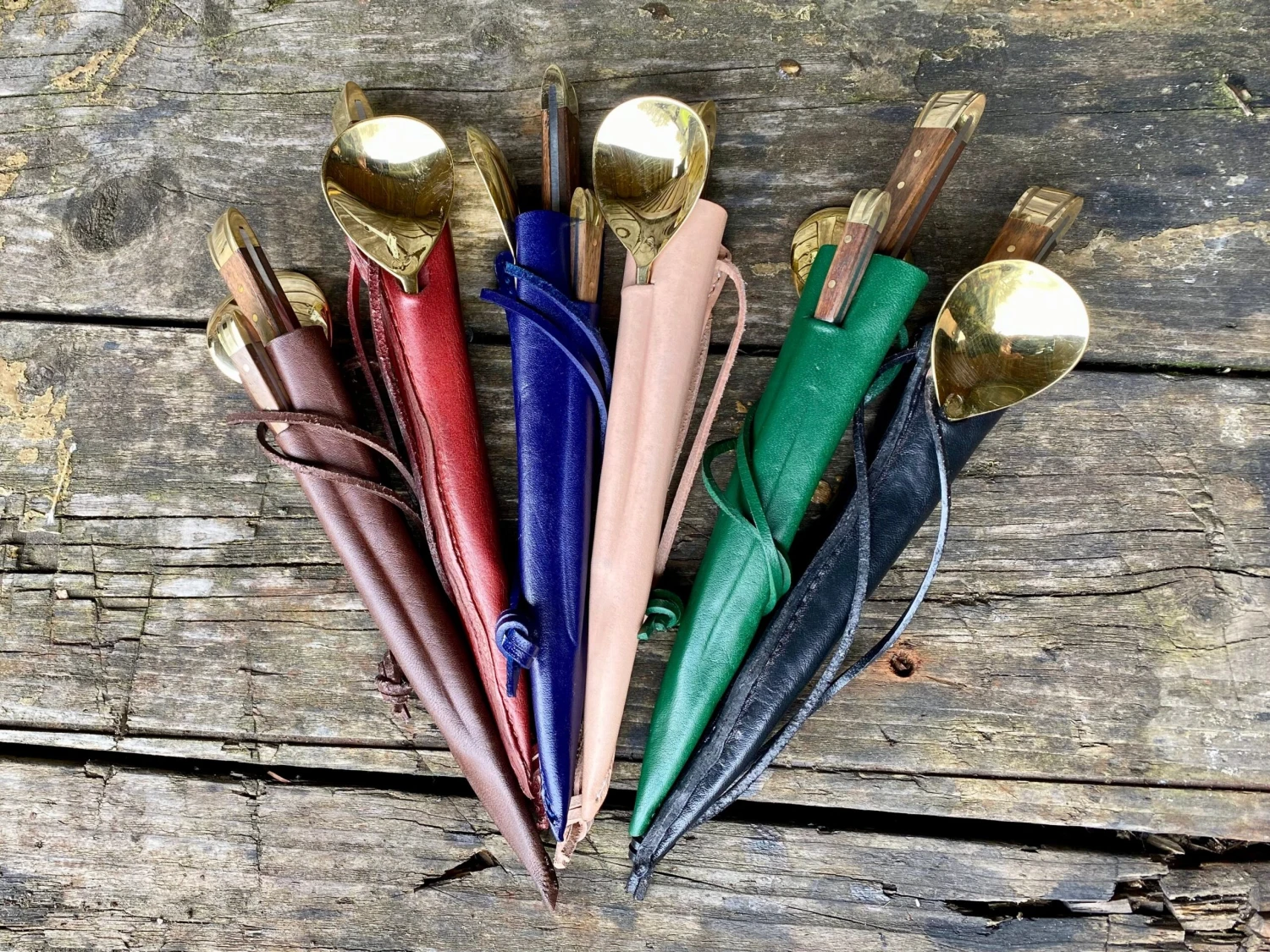 The medieval eating set comes in a 3 pocket moulded veg tan leather sheath.