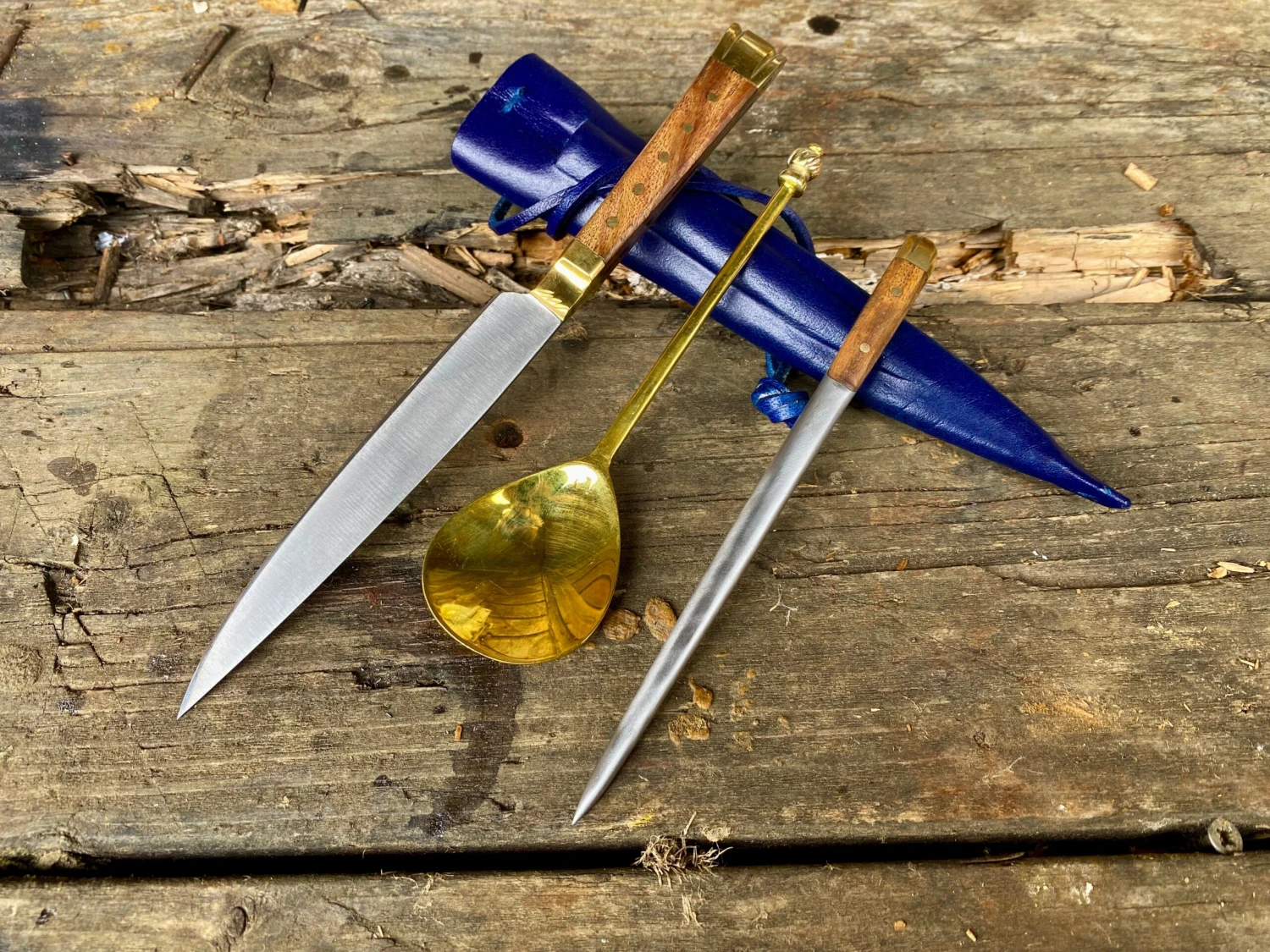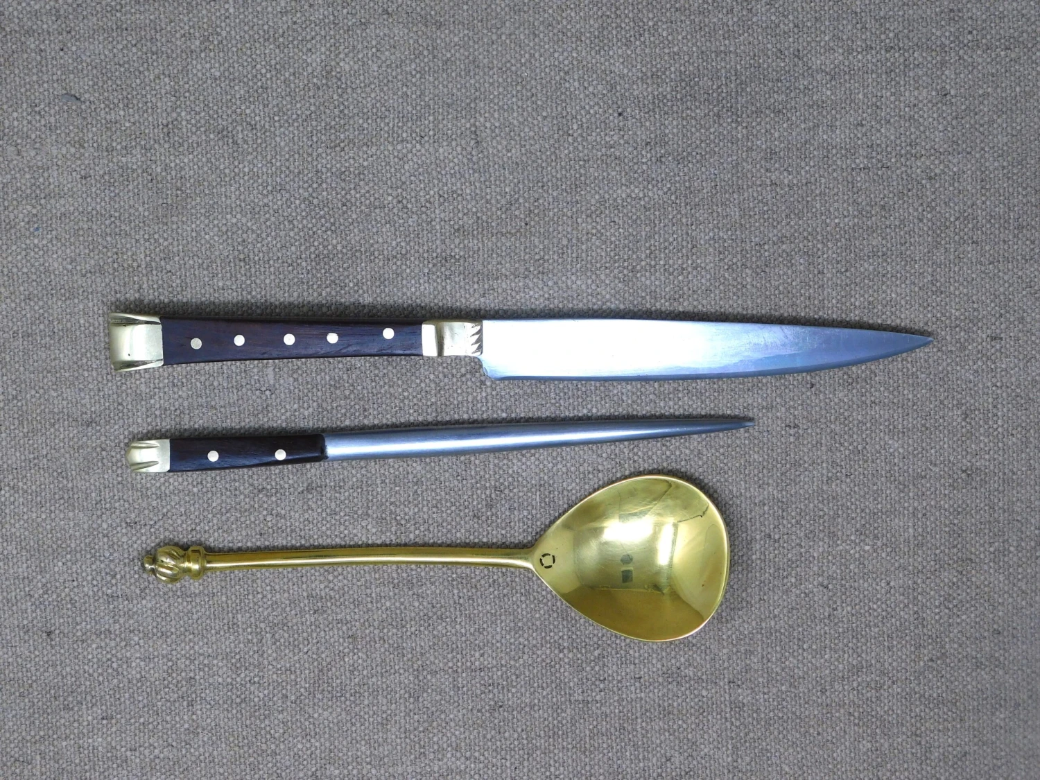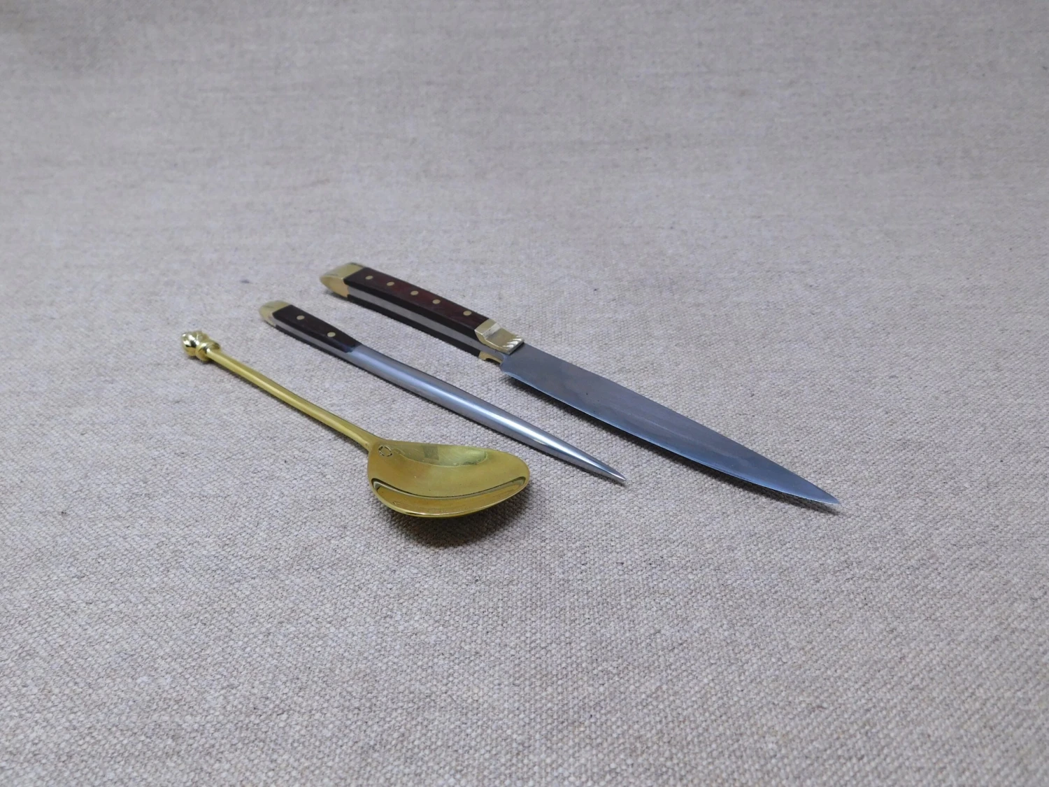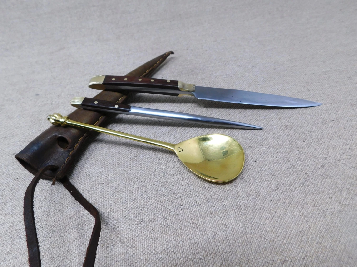 The 15thC medieval eating knife from this medieval eating set is based on a knife from the River Thames find, the spoon and pricker found widely in Europe. I do not know of a medieval eating set of 3 pieces, but you can bet they did – so here you are.
