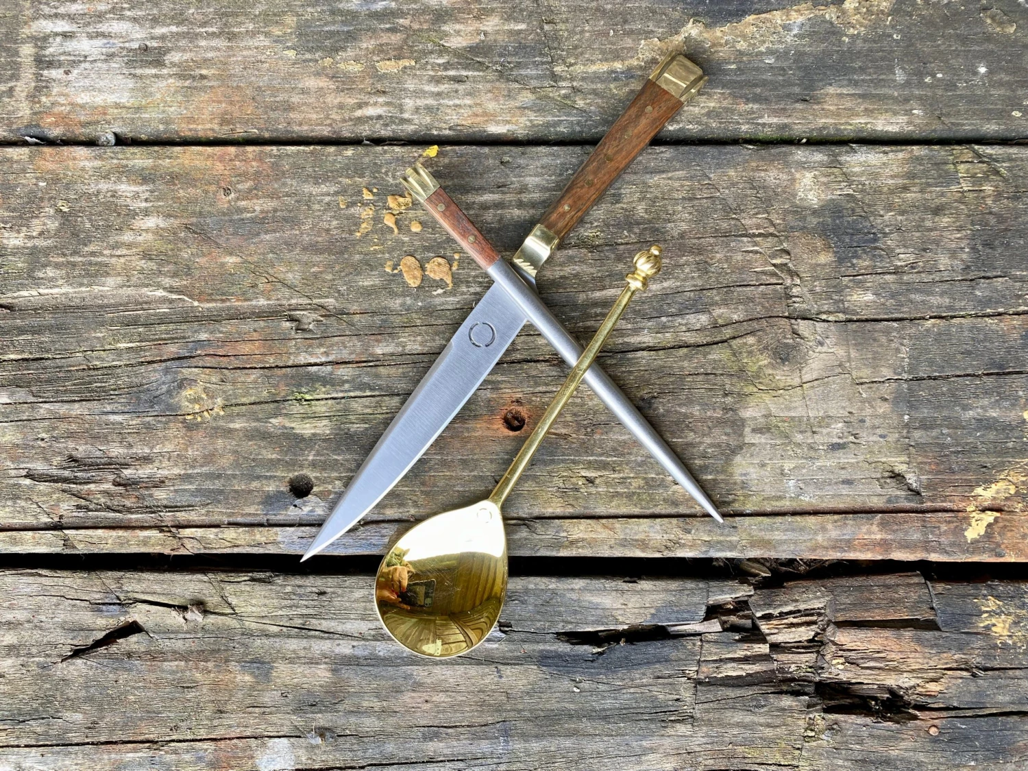 The knife has wooden handle scales and is fitted with brass bolster and pommel and the spoon is brass.