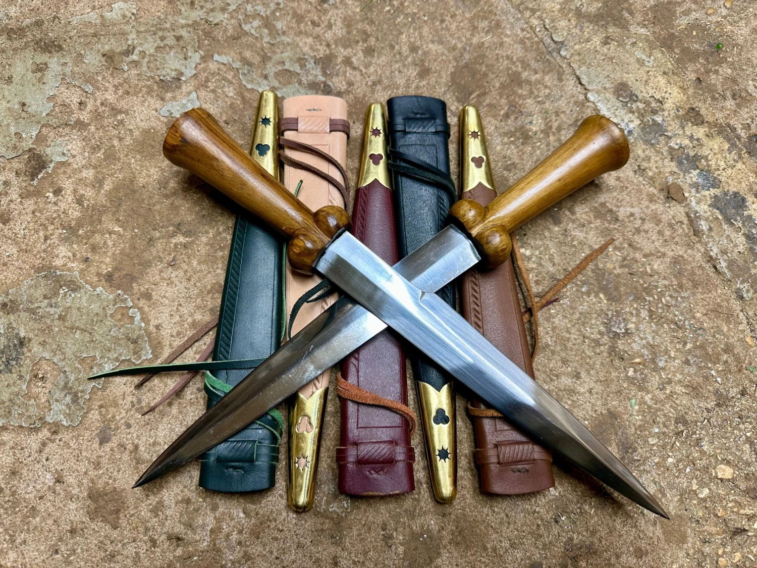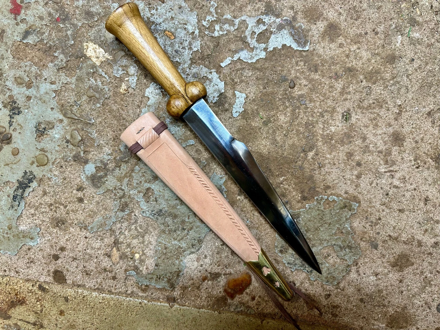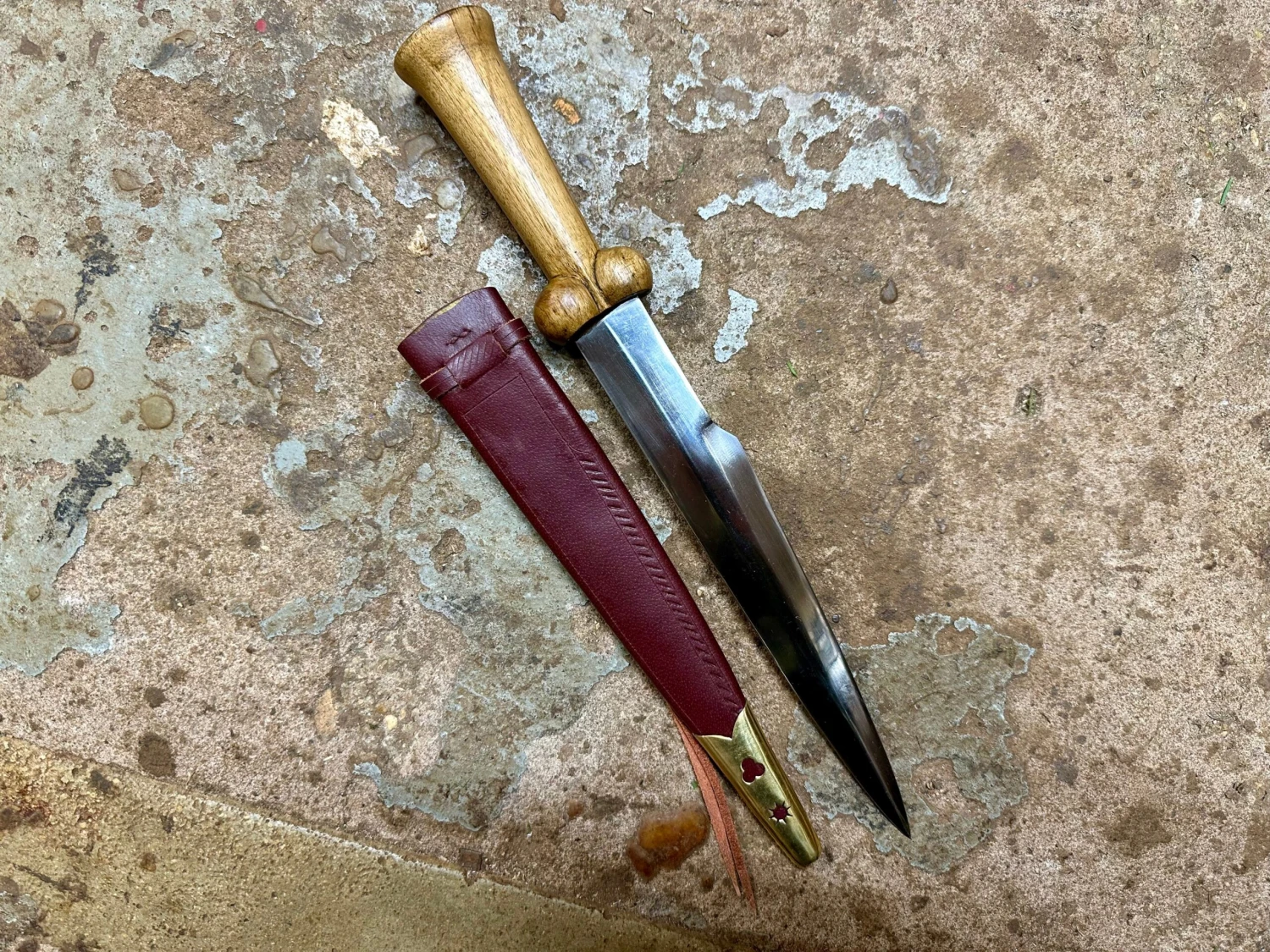 Bollock daggers started around 1300 and were utility knives and at the time that meant both for working around the home, farm and general tasks and part of that would have been civil defence. This blade form is all about this dual use. The double edge is all about fighting and the flat recessed blade back is all about tasks and work and its lowly status is shown in its lack of a guard.
