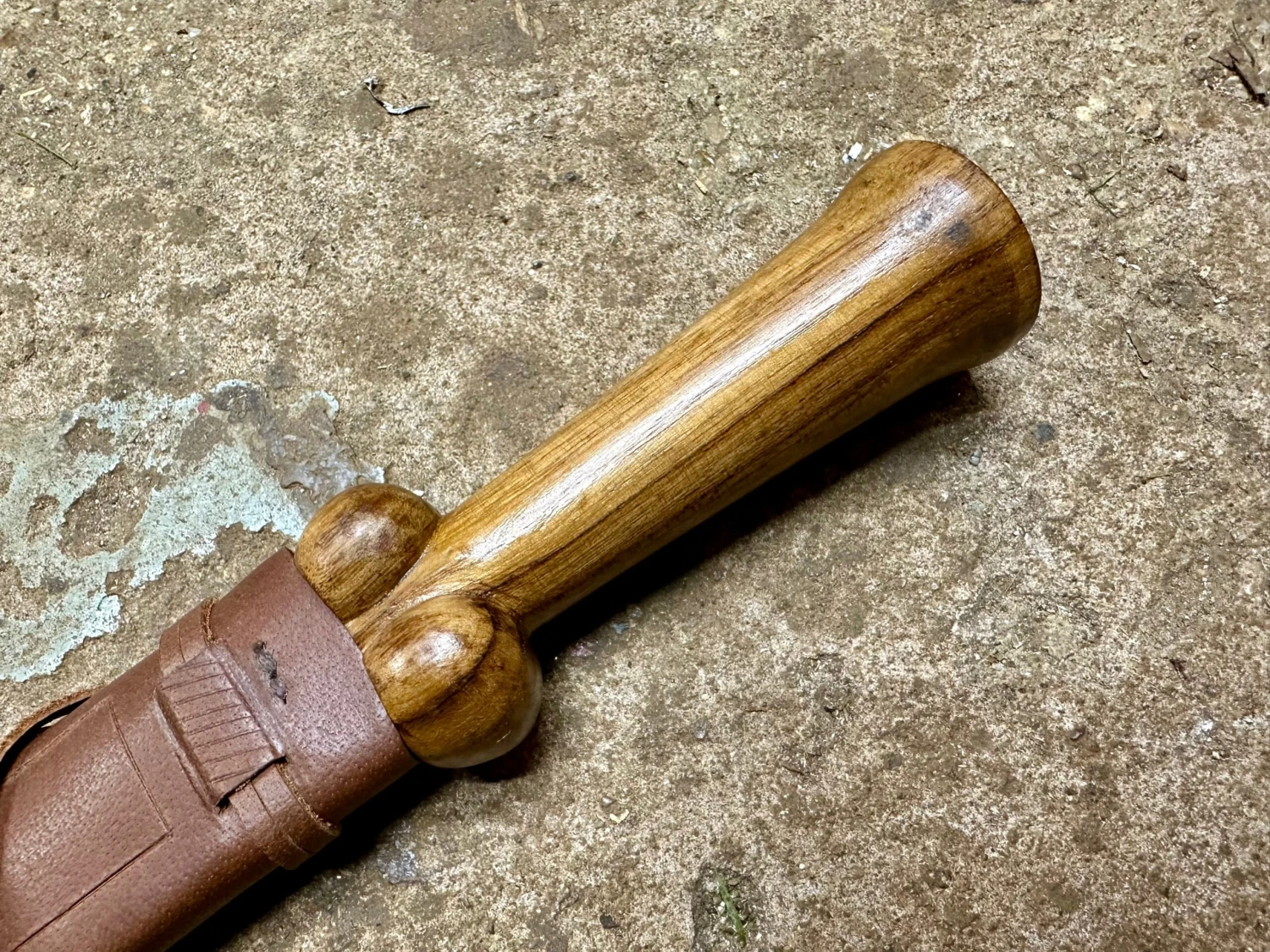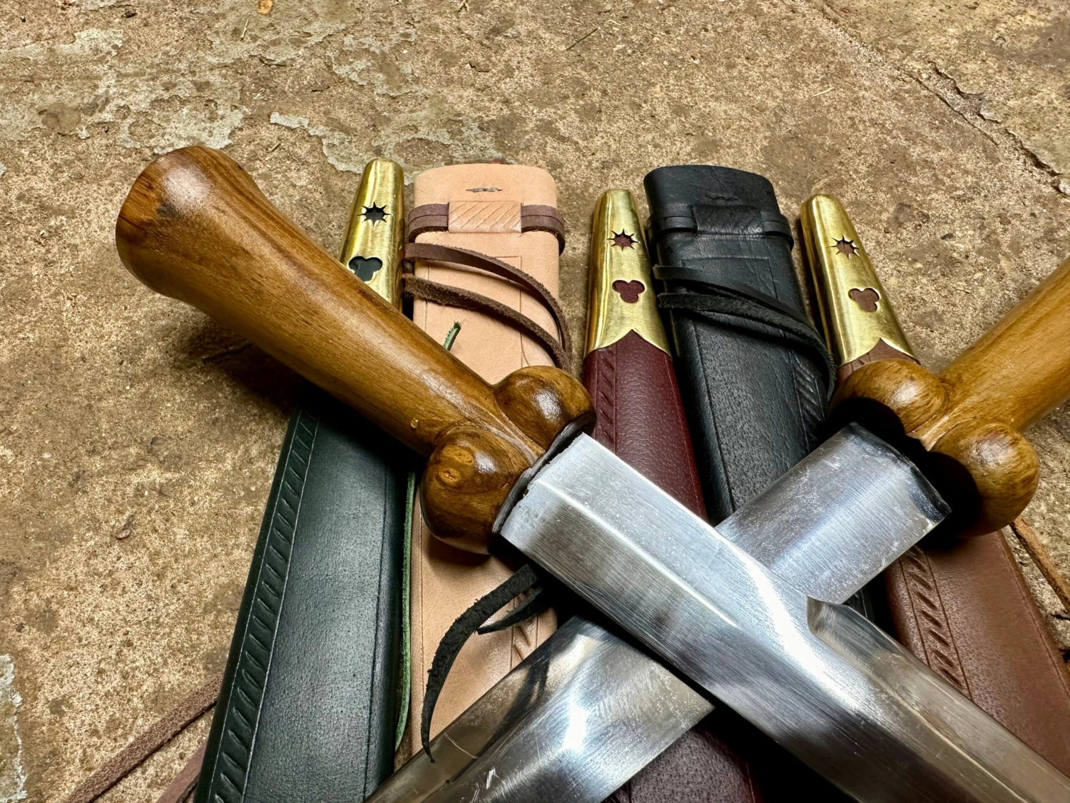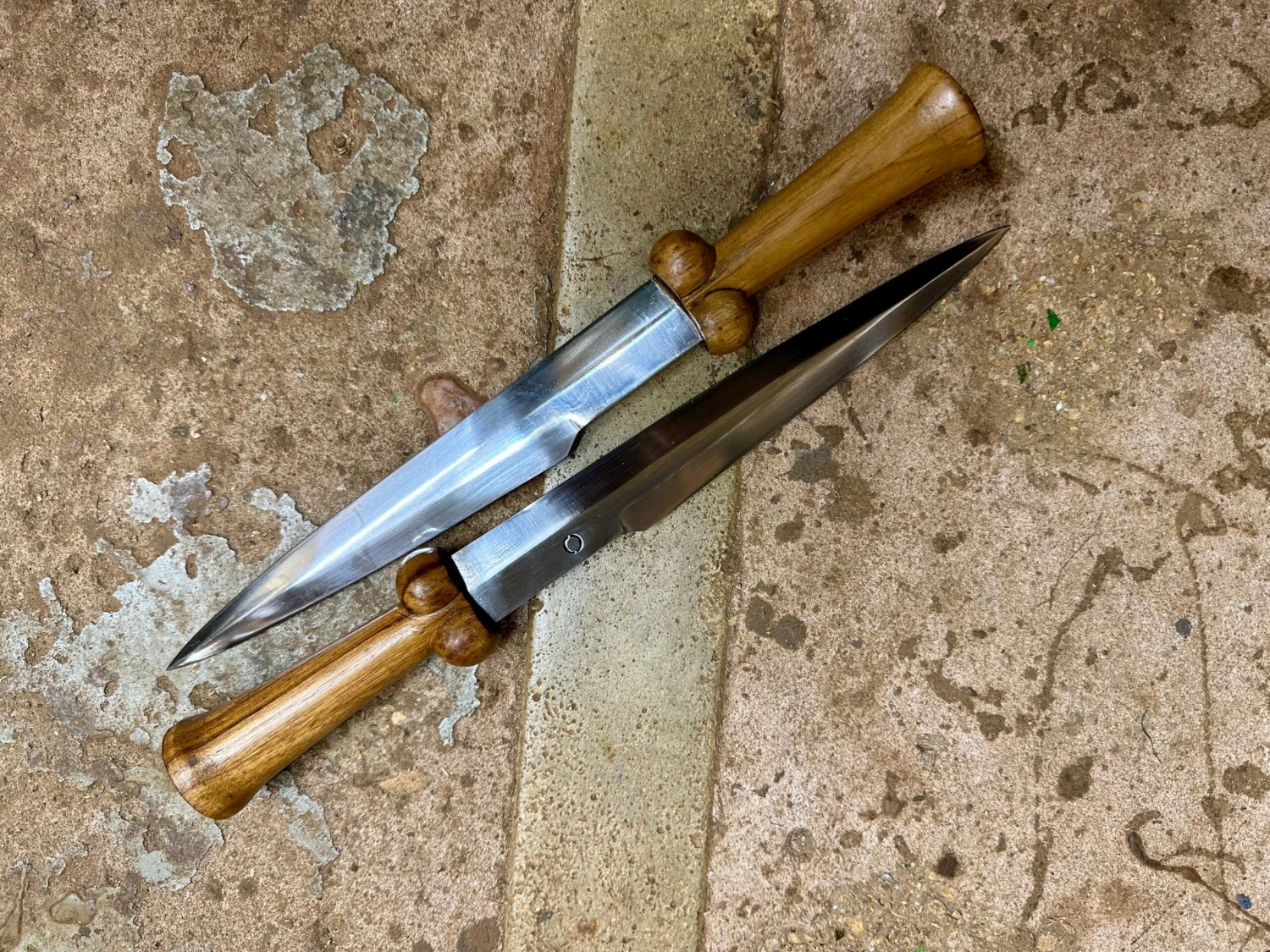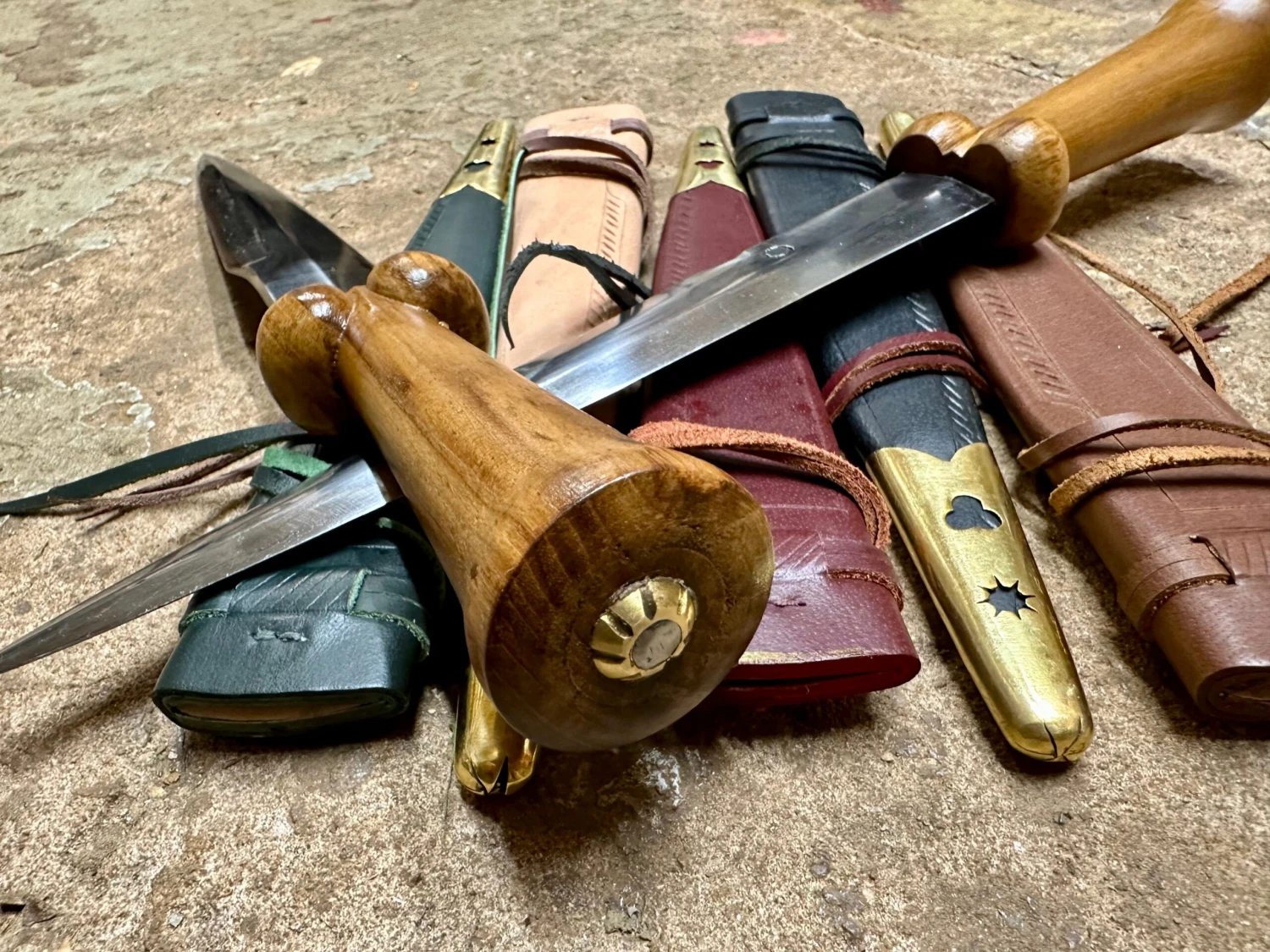 Bollock daggers started around 1300 and were utility knives and at the time that meant both for working around the home, farm and general tasks and part of that would have been civil defence. This blade form is all about this dual use. The double edge is all about fighting and the flat recessed blade back is all about tasks and work and its lowly status is shown in its lack of a guard.