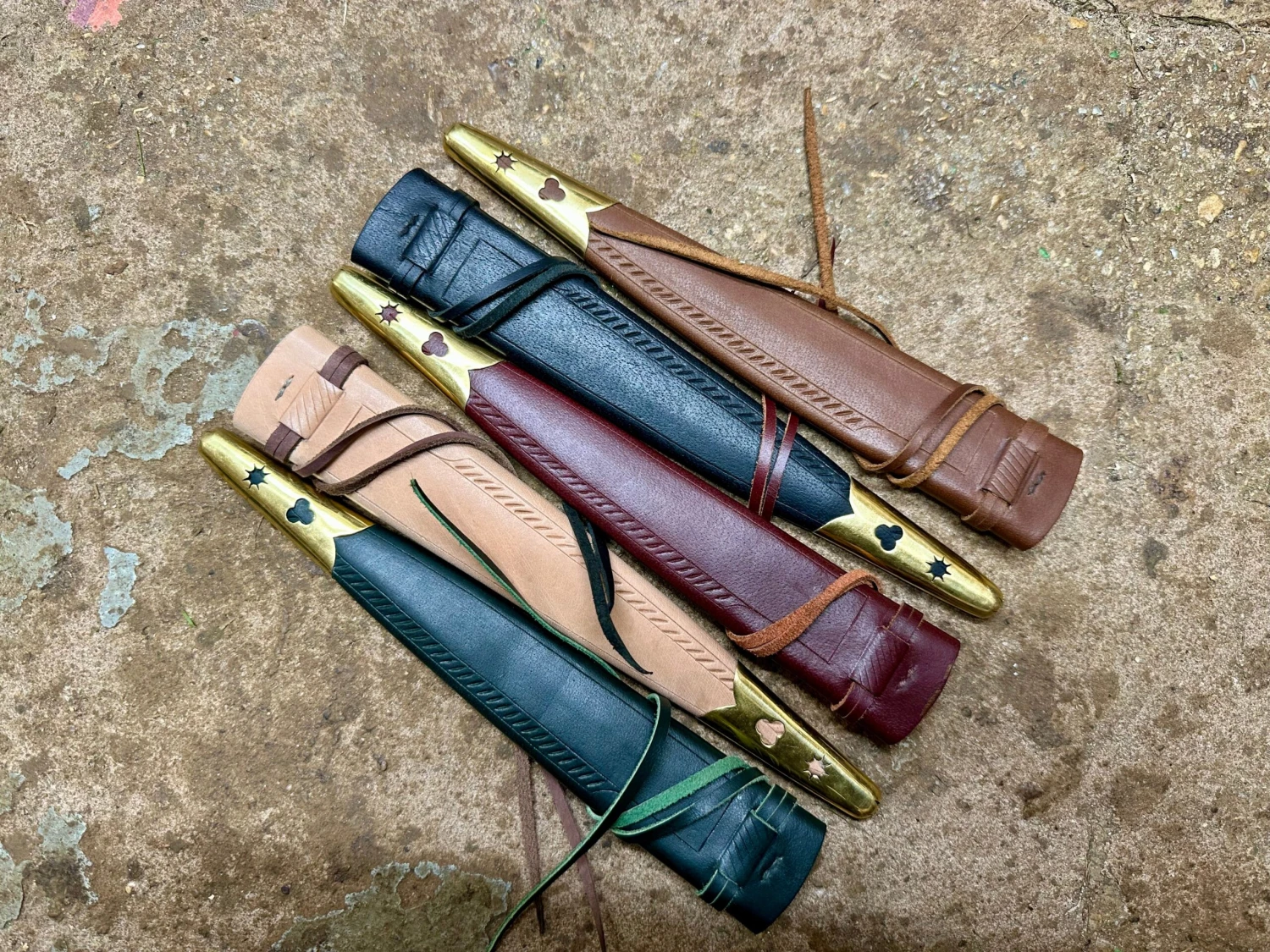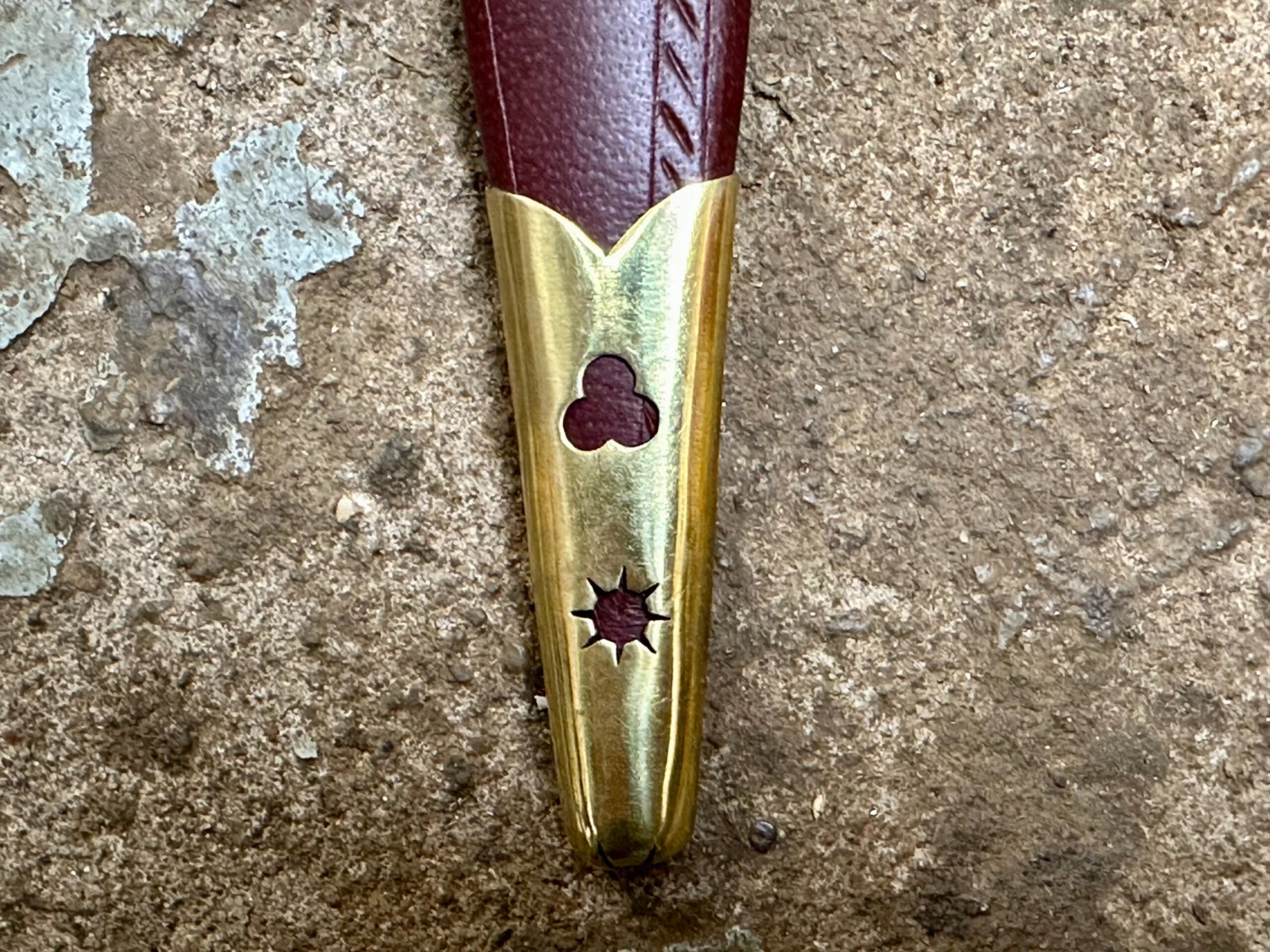 The dagger comes with a double layer leather sheath with some incised decoration and a decorated brass chape.