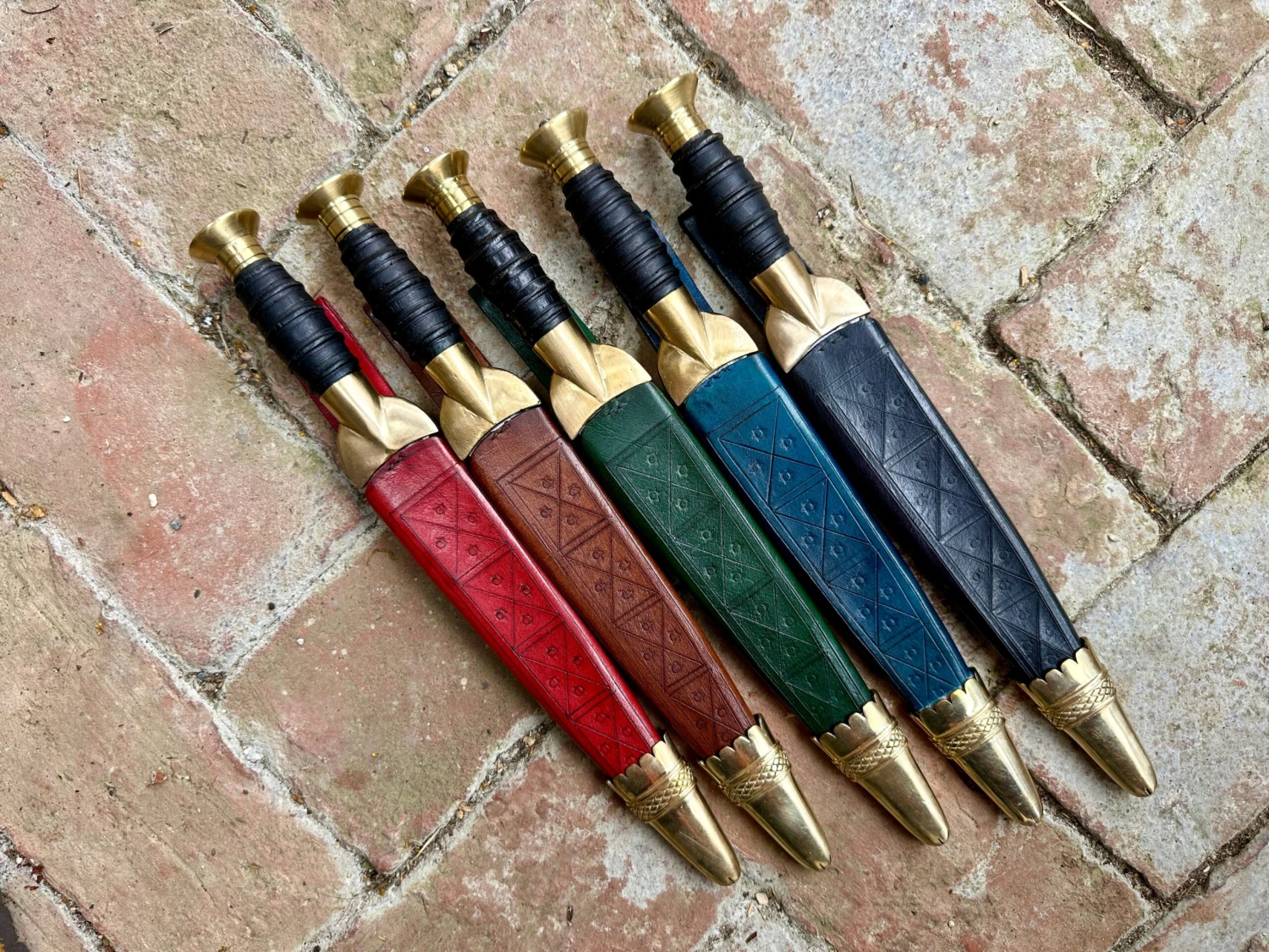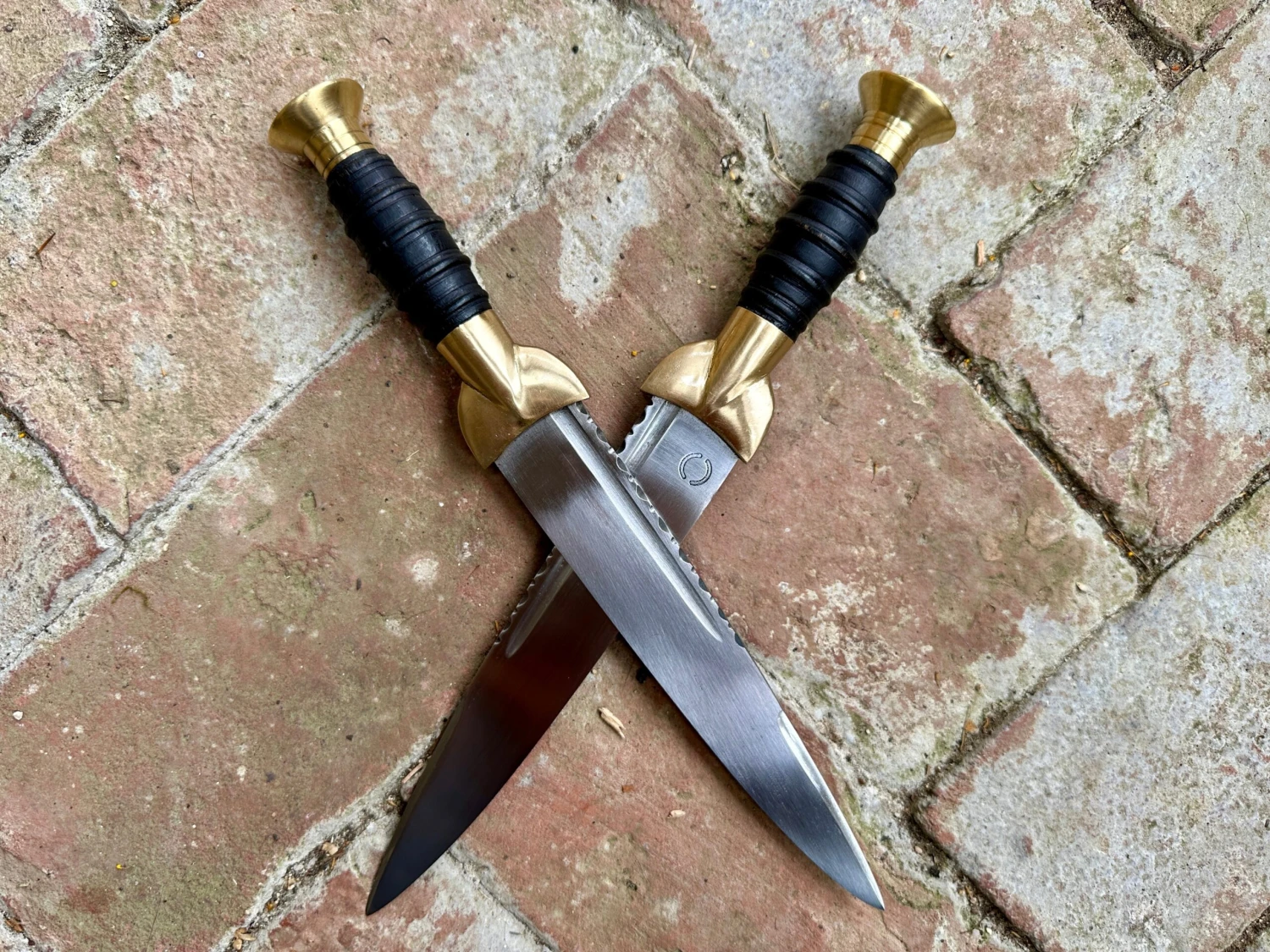 We have 3 sizes of this style; the Sgian Dhu, the short brass and black wood dirk, and the long brass and black wood dirk. Available individually or as a set.