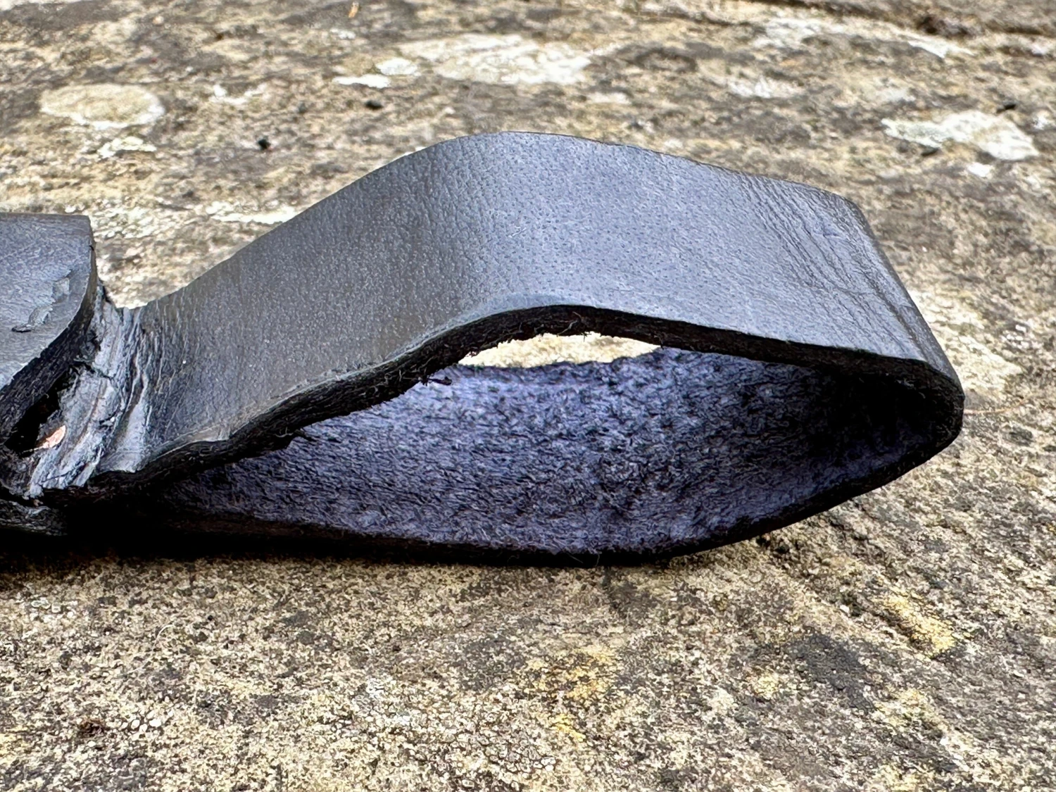 It has a fully functional, 6.75″/17.5cm single edged blade with file work spine and comes with a with a period decorated naturally tanned leather sheath (in red, green, black, brown and new blue) and brass chape.
