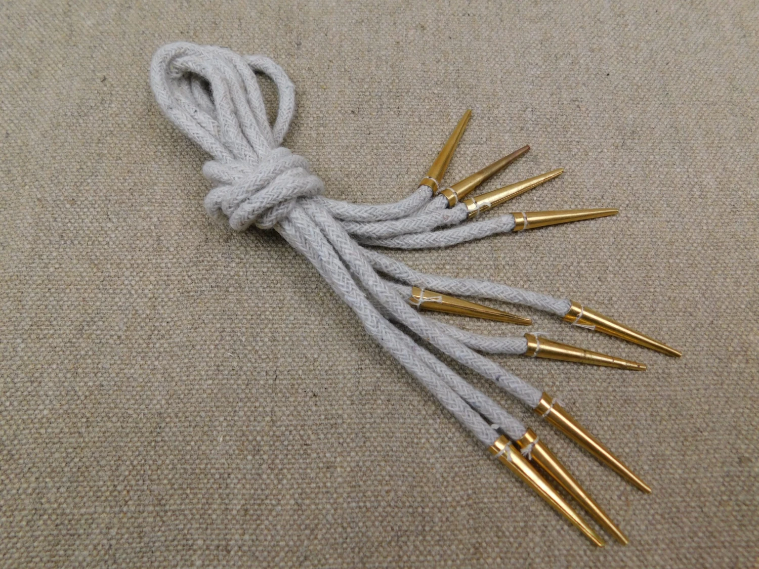 Rolled sheet brass points of aiglets sewn onto braided natural unbleached cotton cords and sold in Packs of 5 pieces.