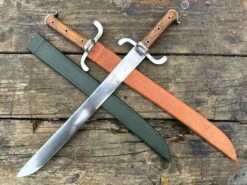 It has a carbon steel sharpened blade and bolsters and comes with a vegtan sheath in either Natural or Brown.