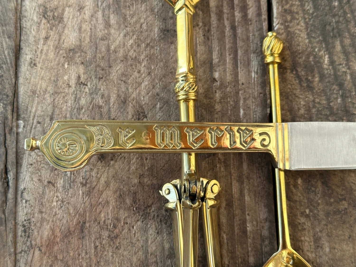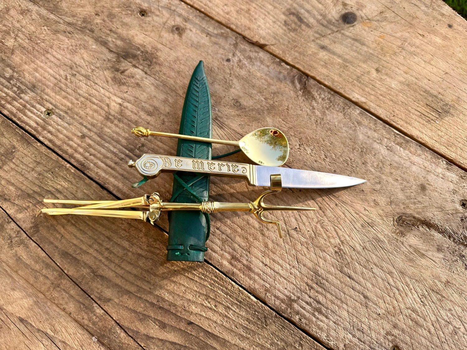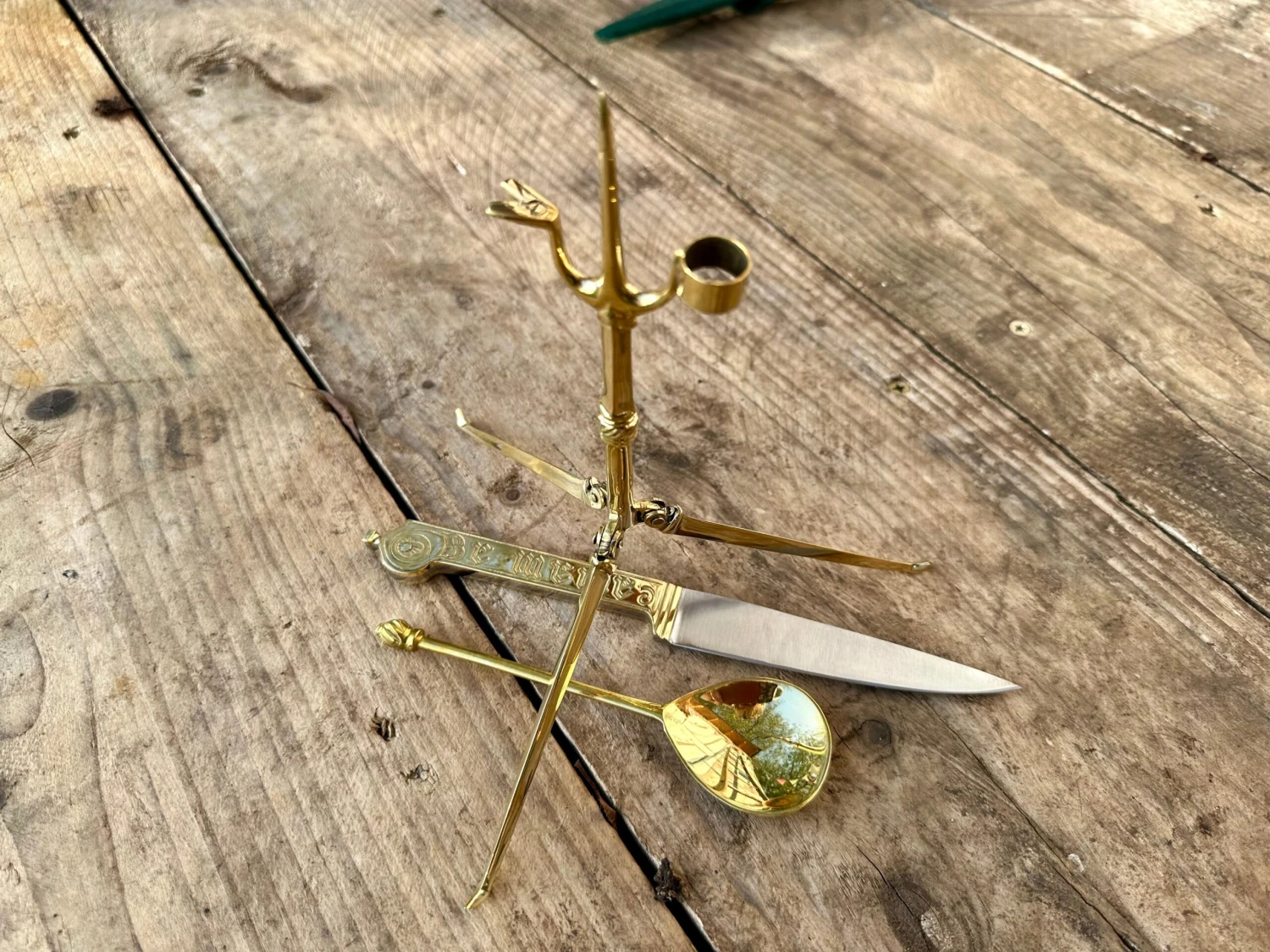 A beautiful bundle of golden brass consisting of The Be Merie/Domine eating knife, brass spoon and brass Pricket candle stick. Very festive.