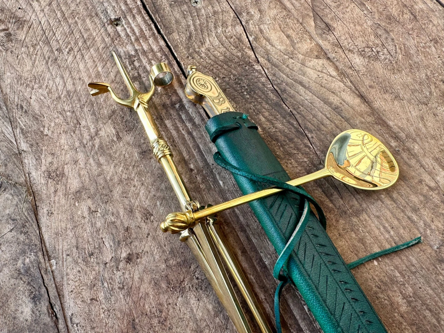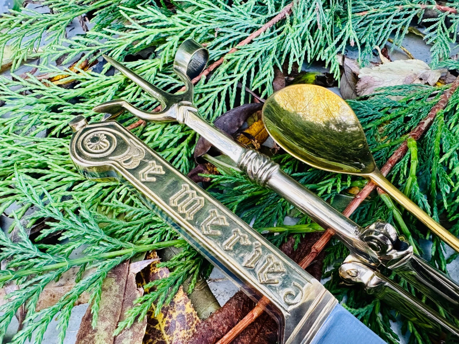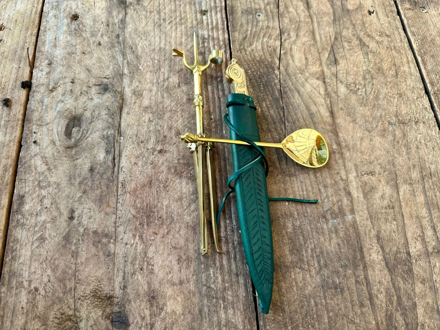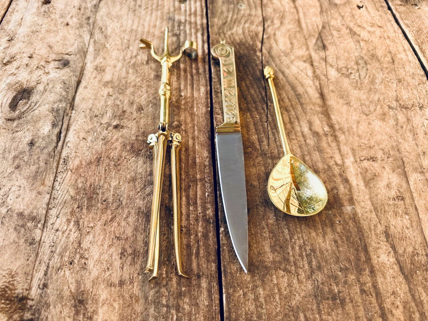 A beautiful bundle of golden brass consisting of The Be Merie/Domine eating knife, brass spoon and brass Pricket candle stick. Very festive.