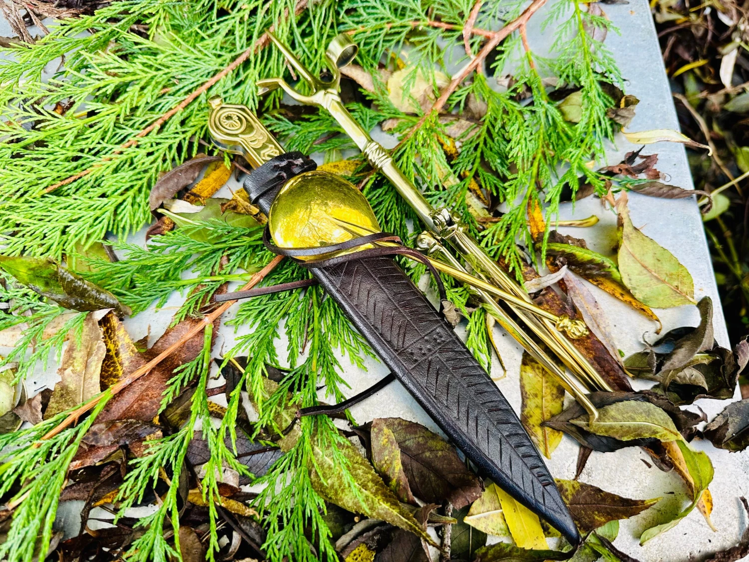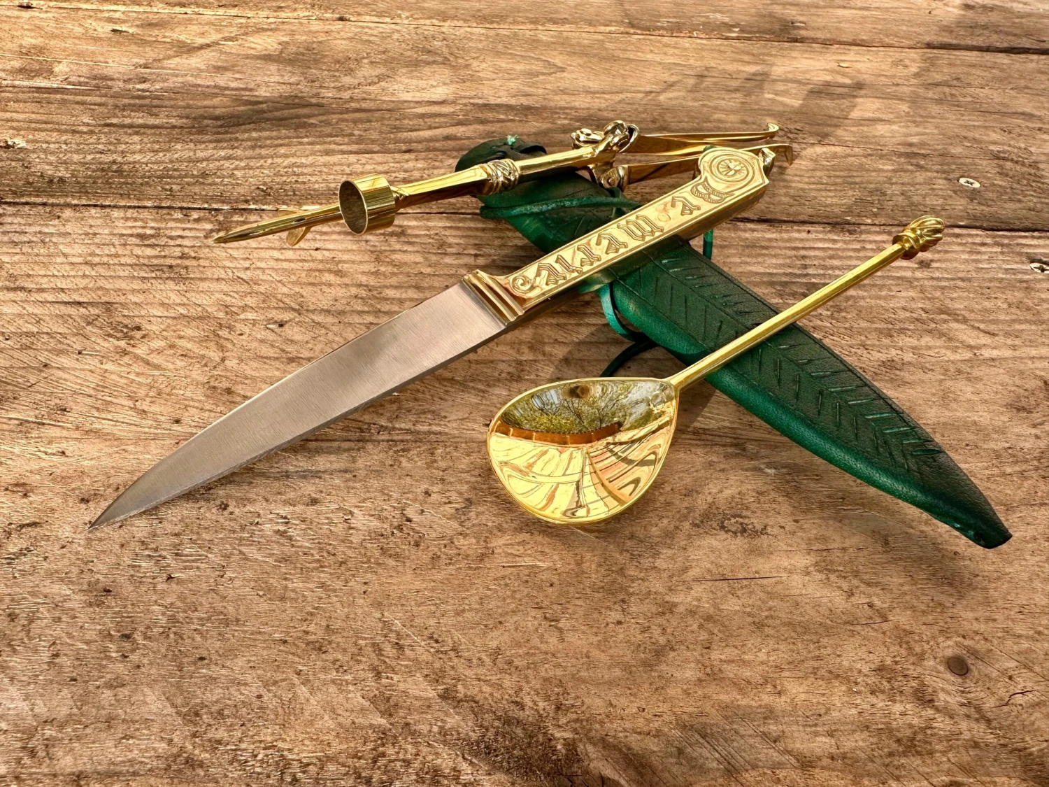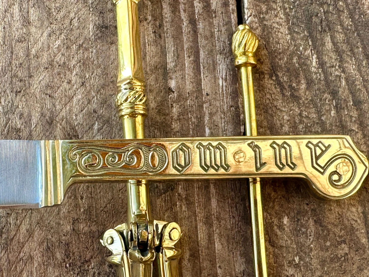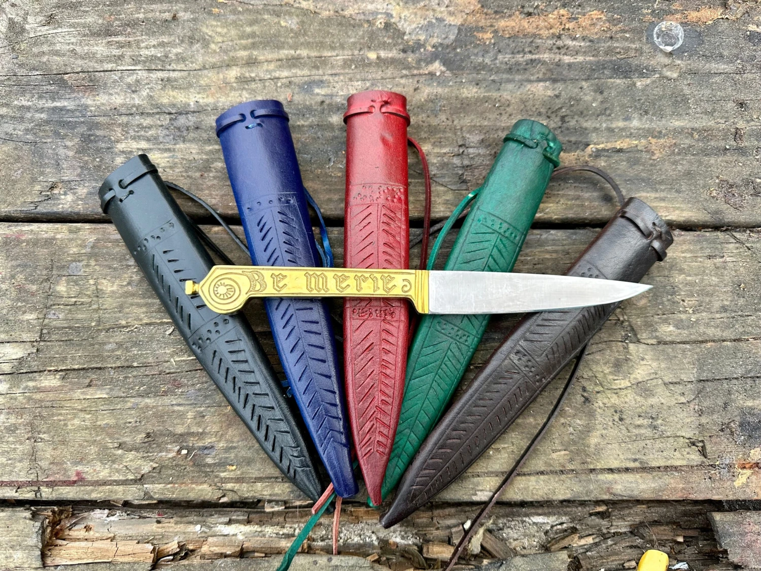Beautiful medieval eating knife with decorated brass handle inscribed with ‘Be Merie’ on one face and ‘Domine’ (Our Lord) on the other. Both motifs were common. These were taken from a 14thC knife but these brass handled knives were popular from 13th through to the 16thC