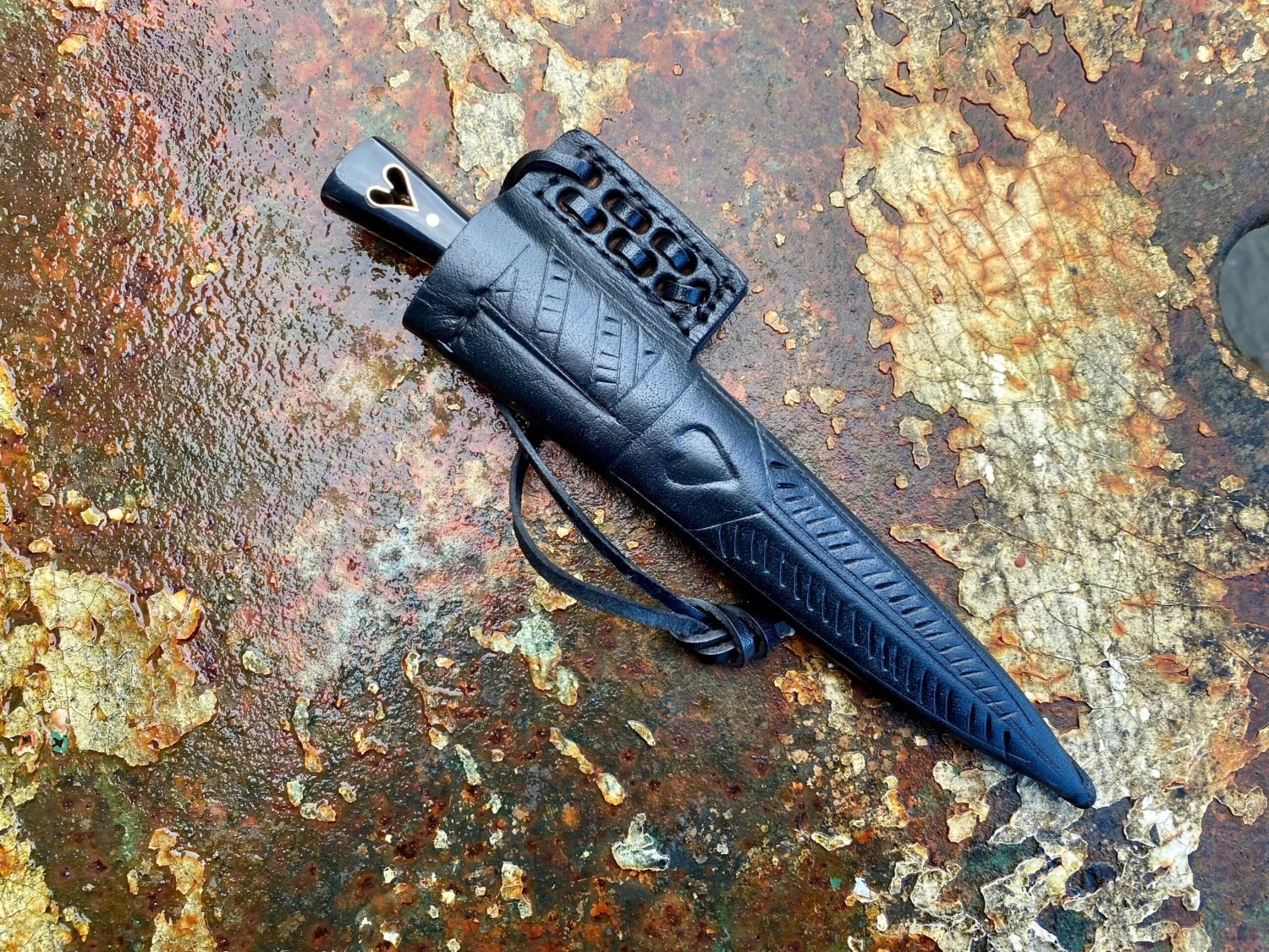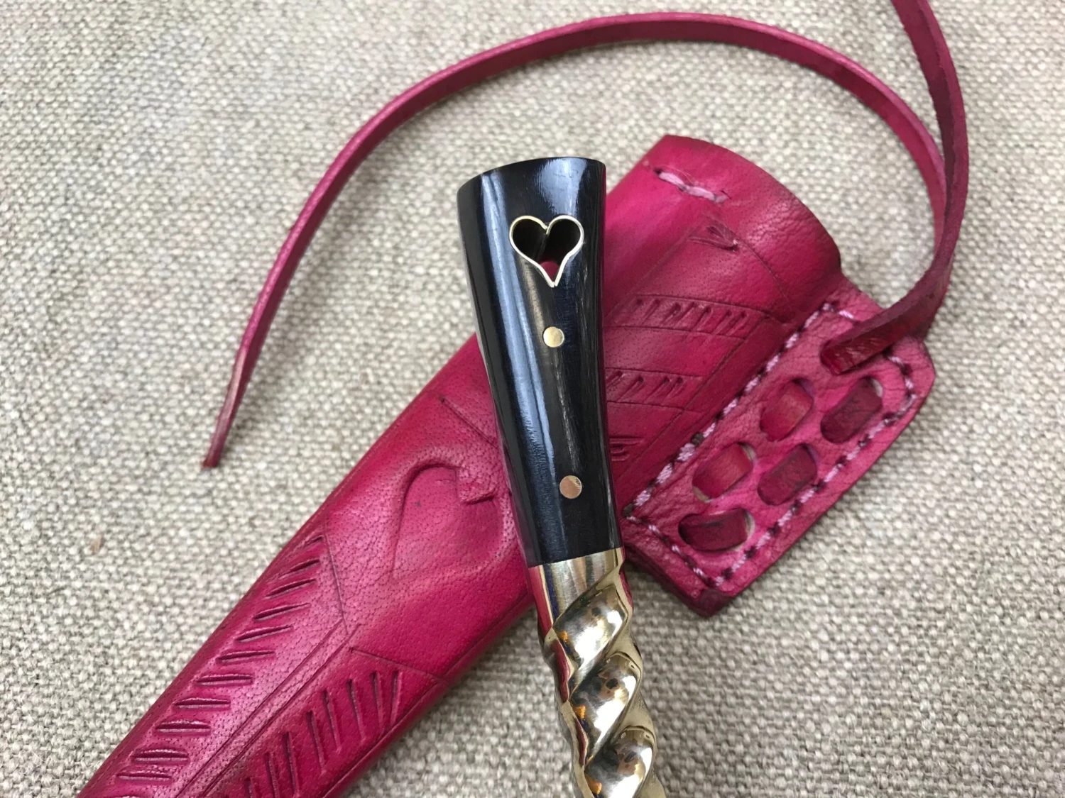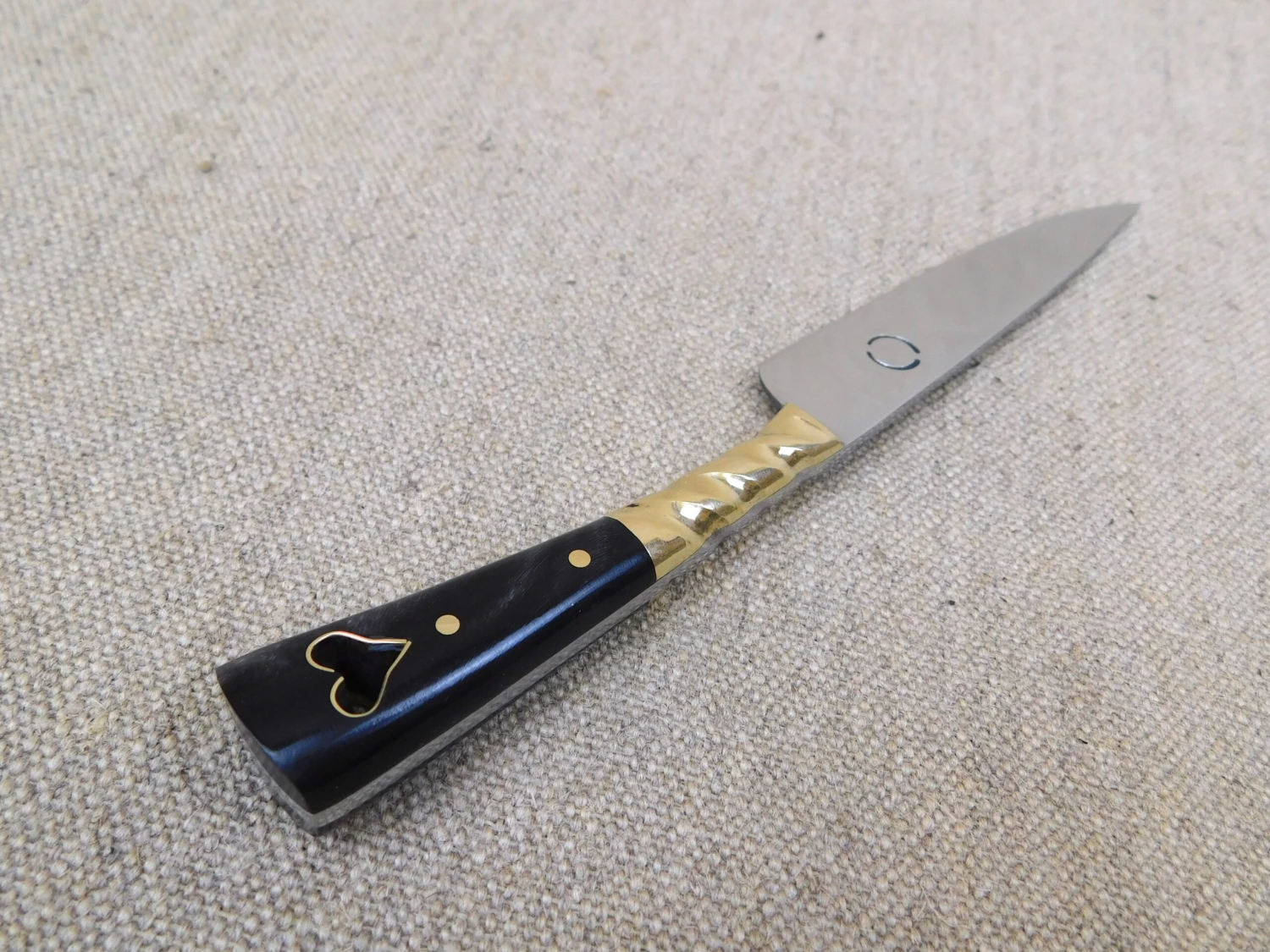 This medieval eating knife is based on a composite of historical examples from the 14thand 15thC. The carbon steel blade is stamped with a makers mark and has a carved brass bolster and black horn grip scales, notably punched through with a cut out heart lined in brass.