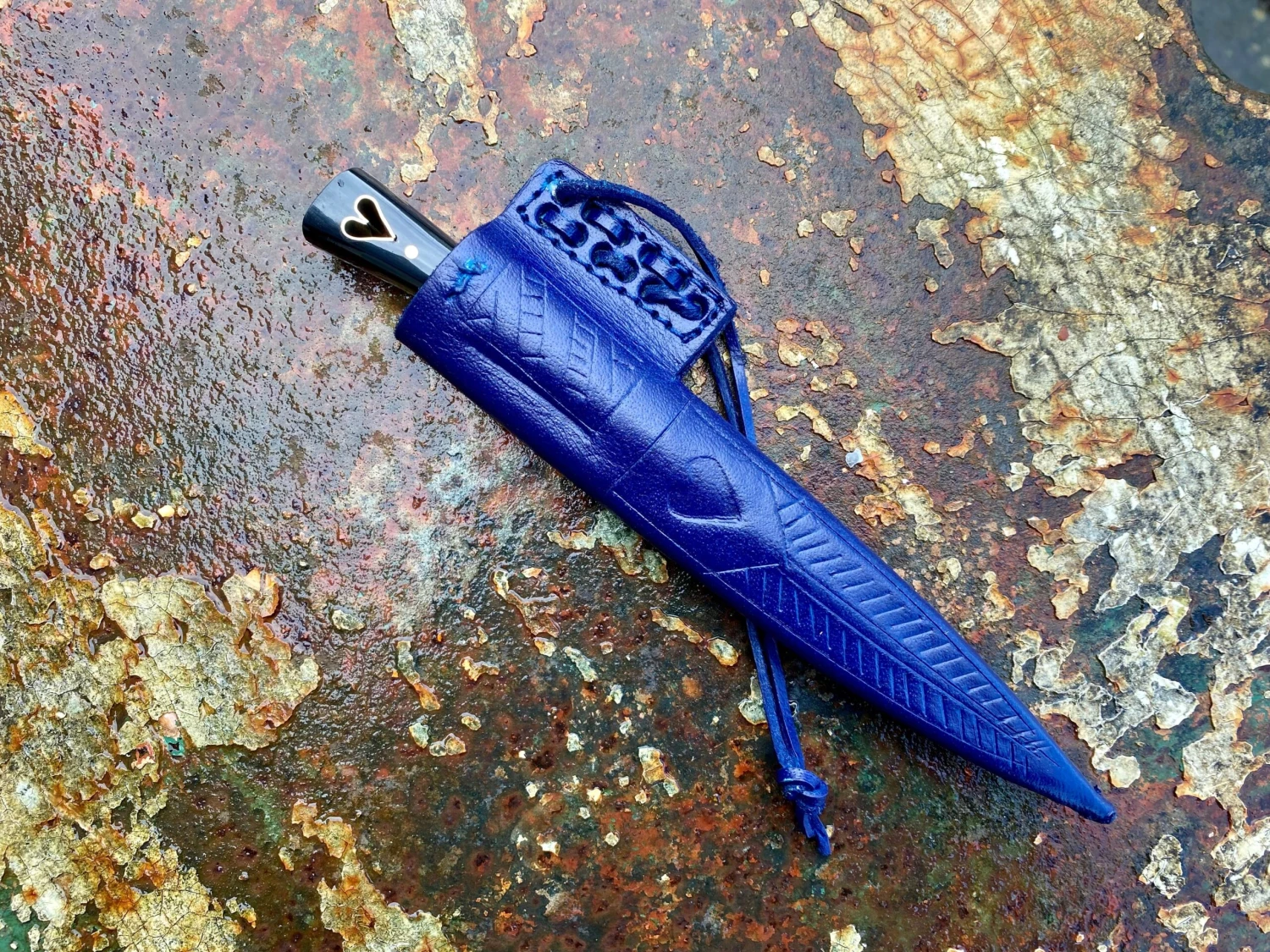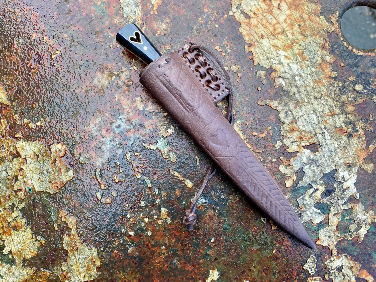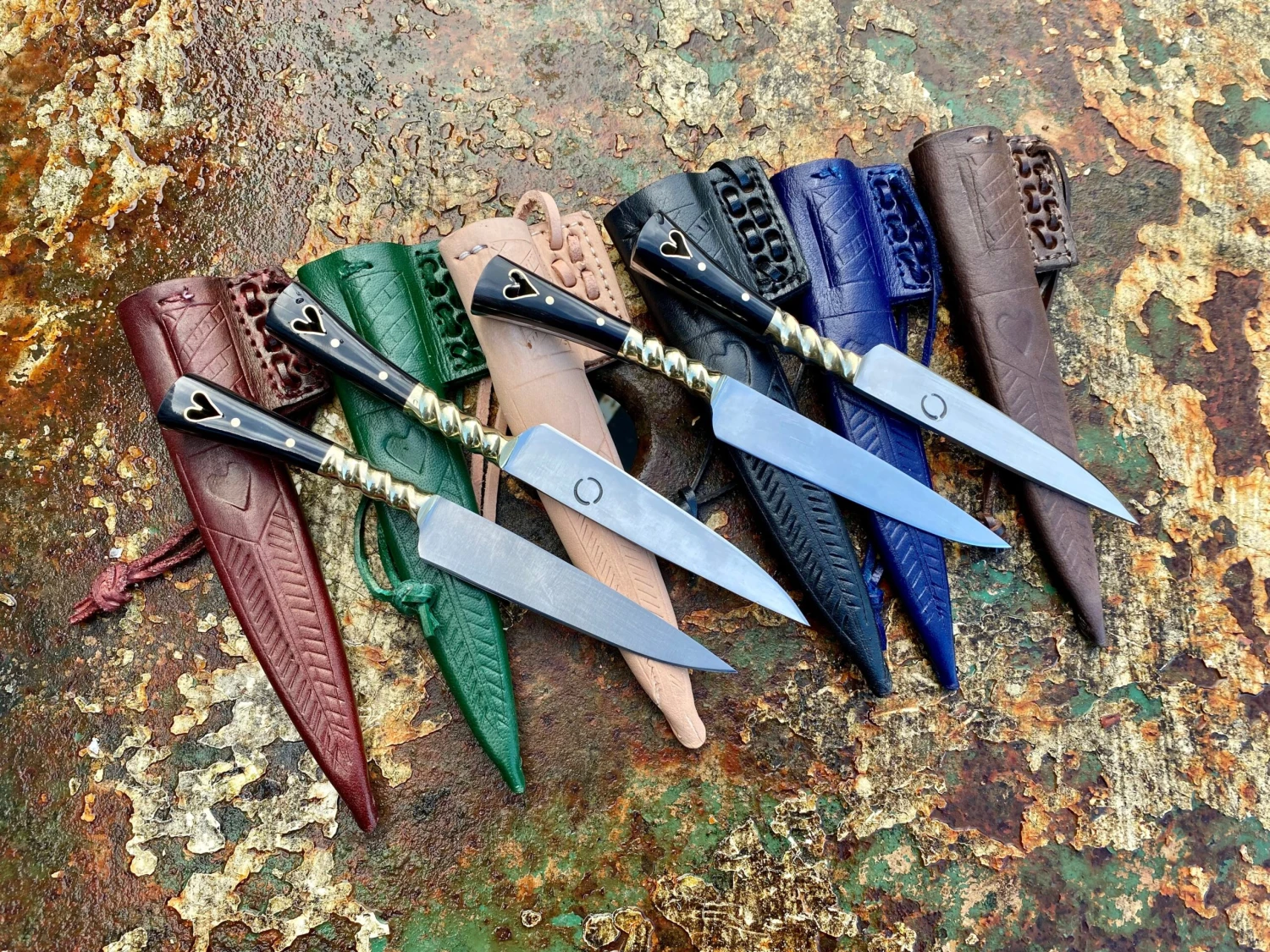 This medieval eating knife is based on a composite of historical examples from the 14thand 15thC. The carbon steel blade is stamped with a makers mark and has a carved brass bolster and black horn grip scales, notably punched through with a cut out heart lined in brass.
