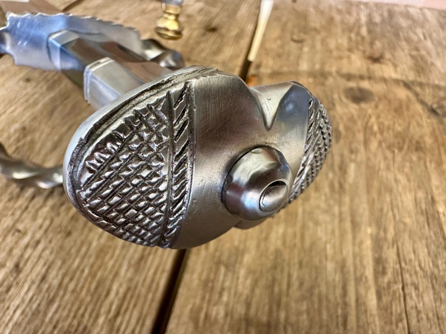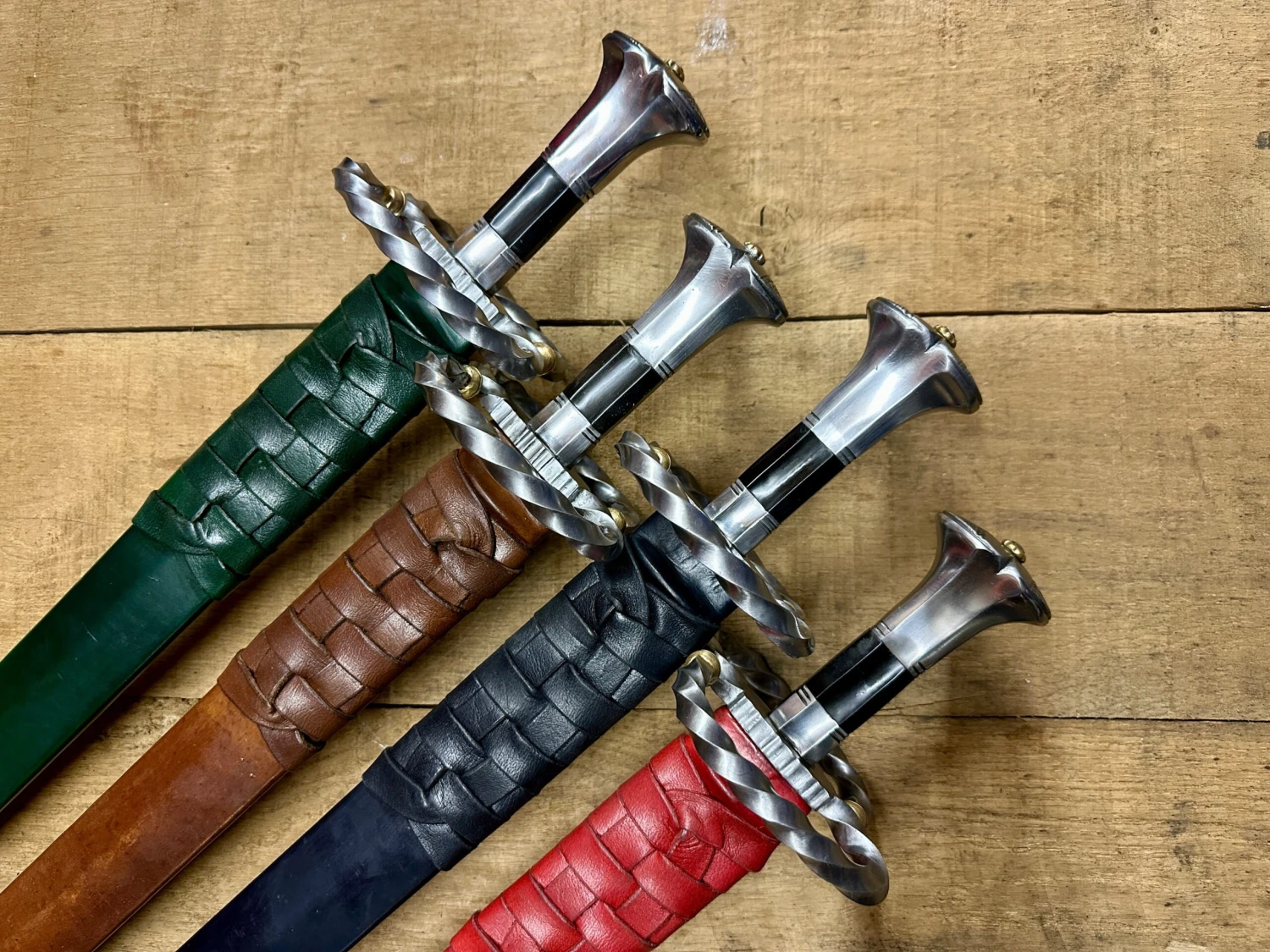 The hand forged sword is made from 1060 spring steel and has a short fullered lenticular section blade with a rounded spatulate tip. The guard is formed of twisted bars formed into the characteristic ‘S’ shape so beloved by Landsknechts, black horn grip and steel fishtail pommel and brass or steel tang button.