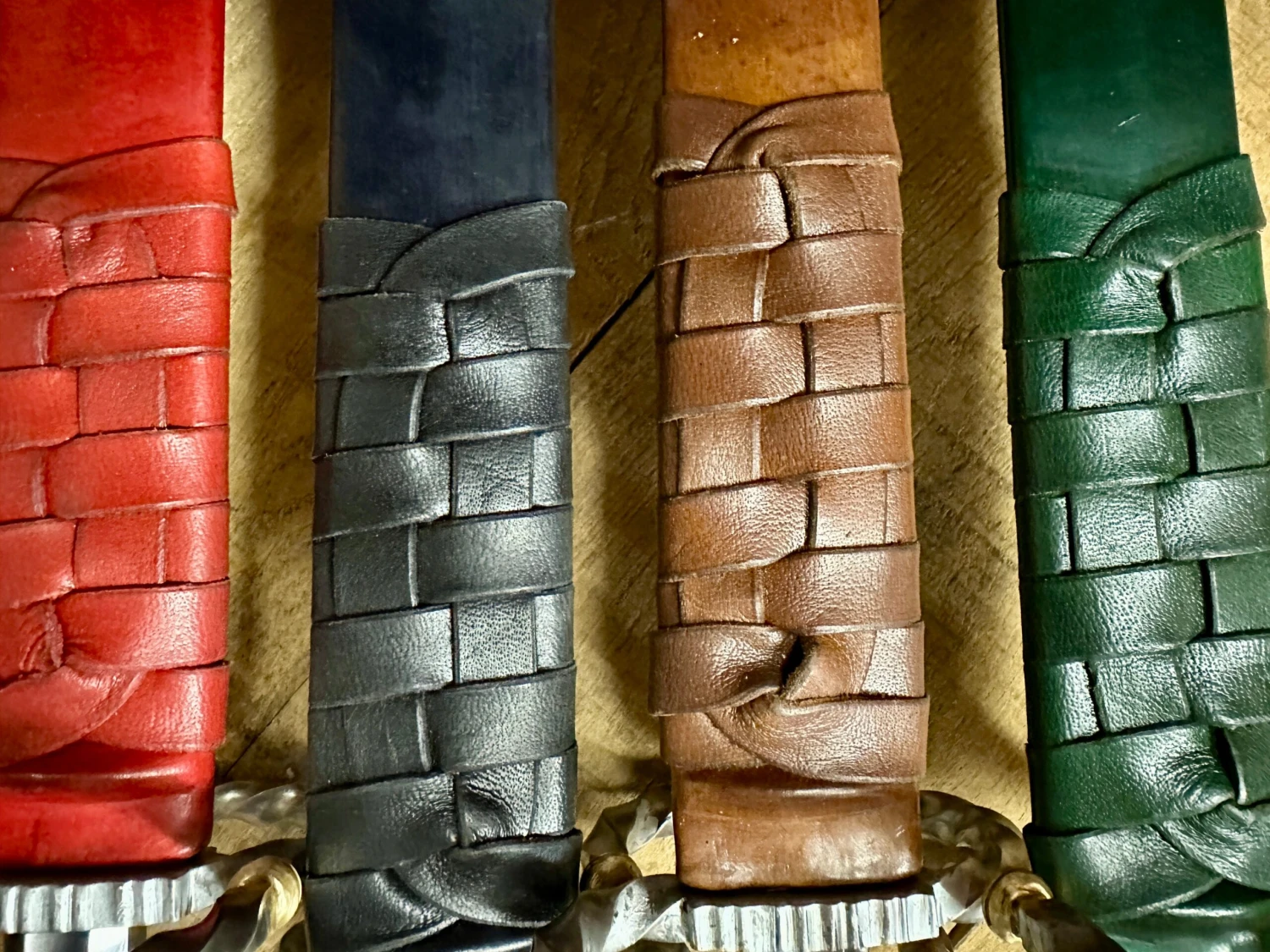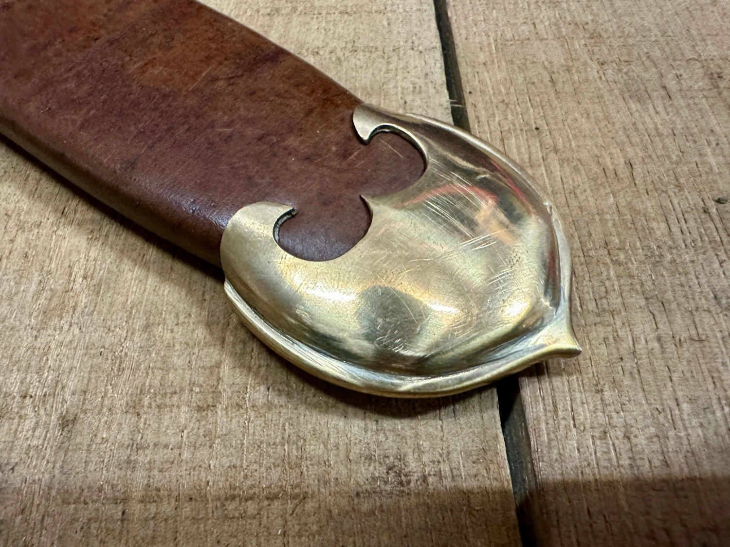 The scabbard is made in wood cored leather and finished with a typical woven strapped leather suspension point and leather belt. It is made to wear the sword near horizontal, as was the fashion and finished with a brass chape.