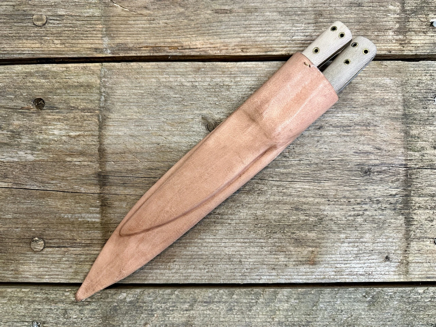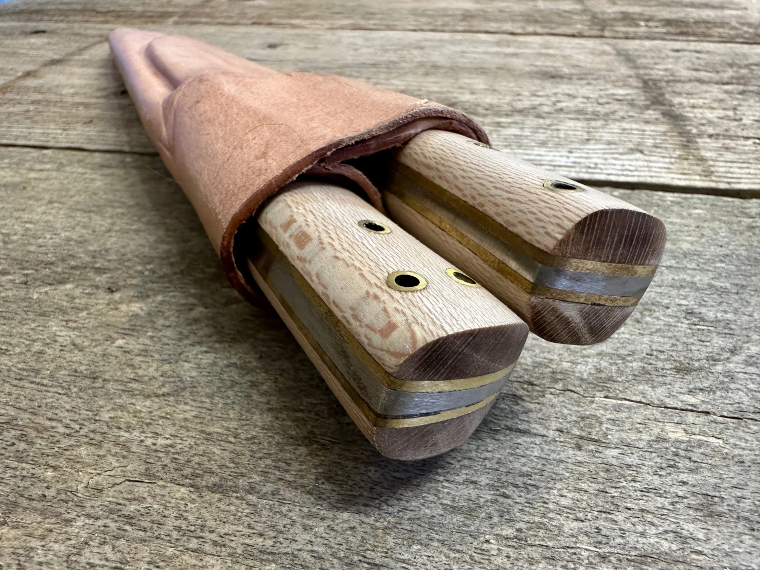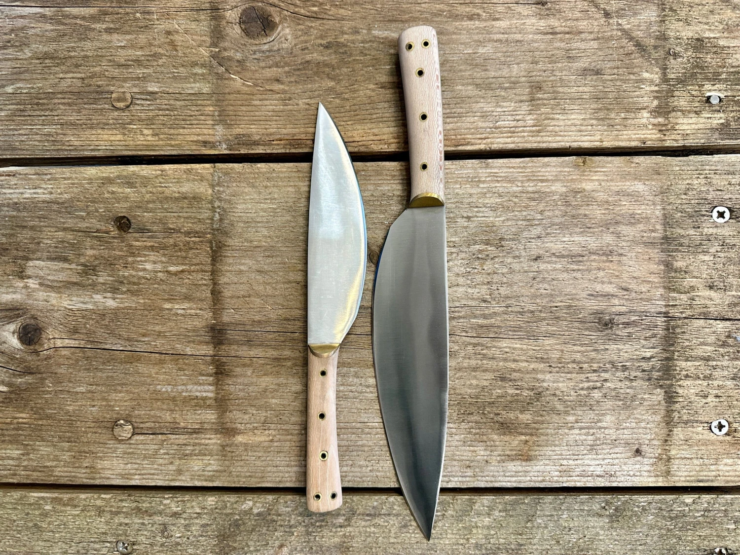 Robust pair of cooks knives with leaf shaped curved blades giving a great cutting action. Maple handles with brass liners, bolster and hollow rivets. Suits camps and cooks through the ages.