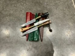Wooden handle, brass rivets, Carbon steel blade, decorated veg tan leather sheath.