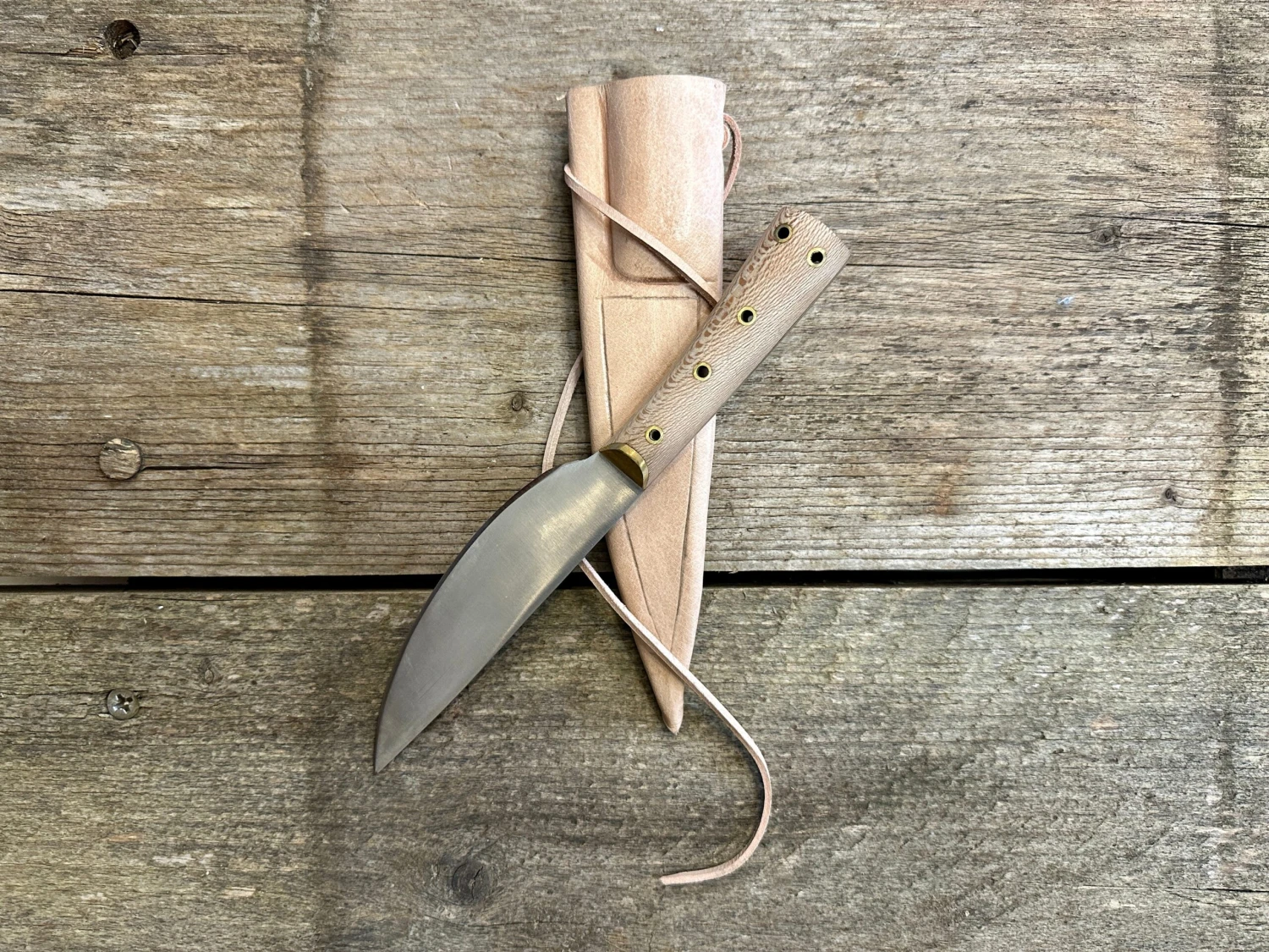 Maple handles with brass liners, bolster and hollow rivets. Suits camps and cooks through the ages. Small enough to be used as an eating or every day use knife as well as for cooking. Perfect for that medieval chef or bushcrafter in you.