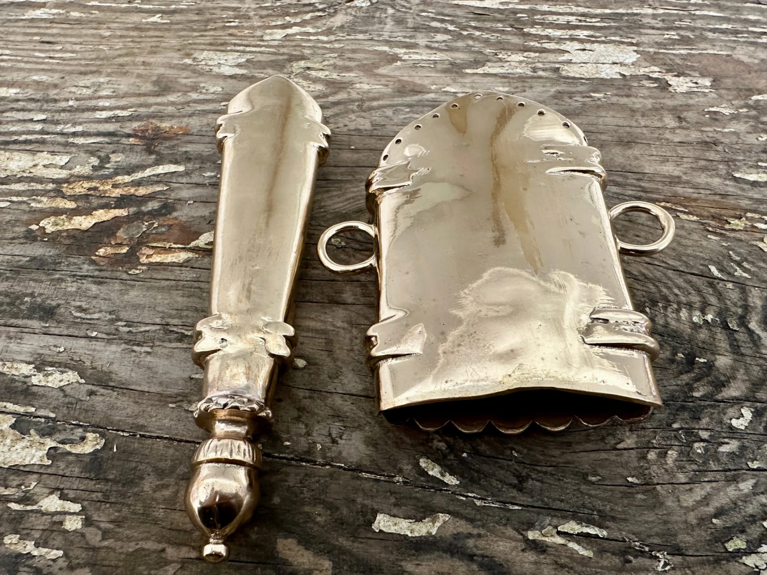 Scabbard fittings based on those of the Dennington Effigy, so suitable for around the year 1400. These belonged to a relatively affulent Knight and were fitted to a longsword, shown veritcally as they so often were. Cast in bronze with the IHS monogram. Top of the throat fitting is set up to accept a triangular rain flap.